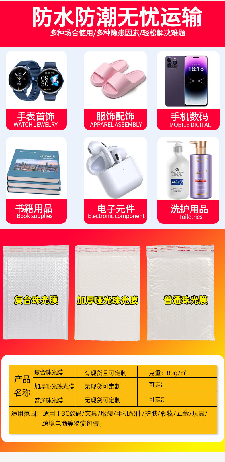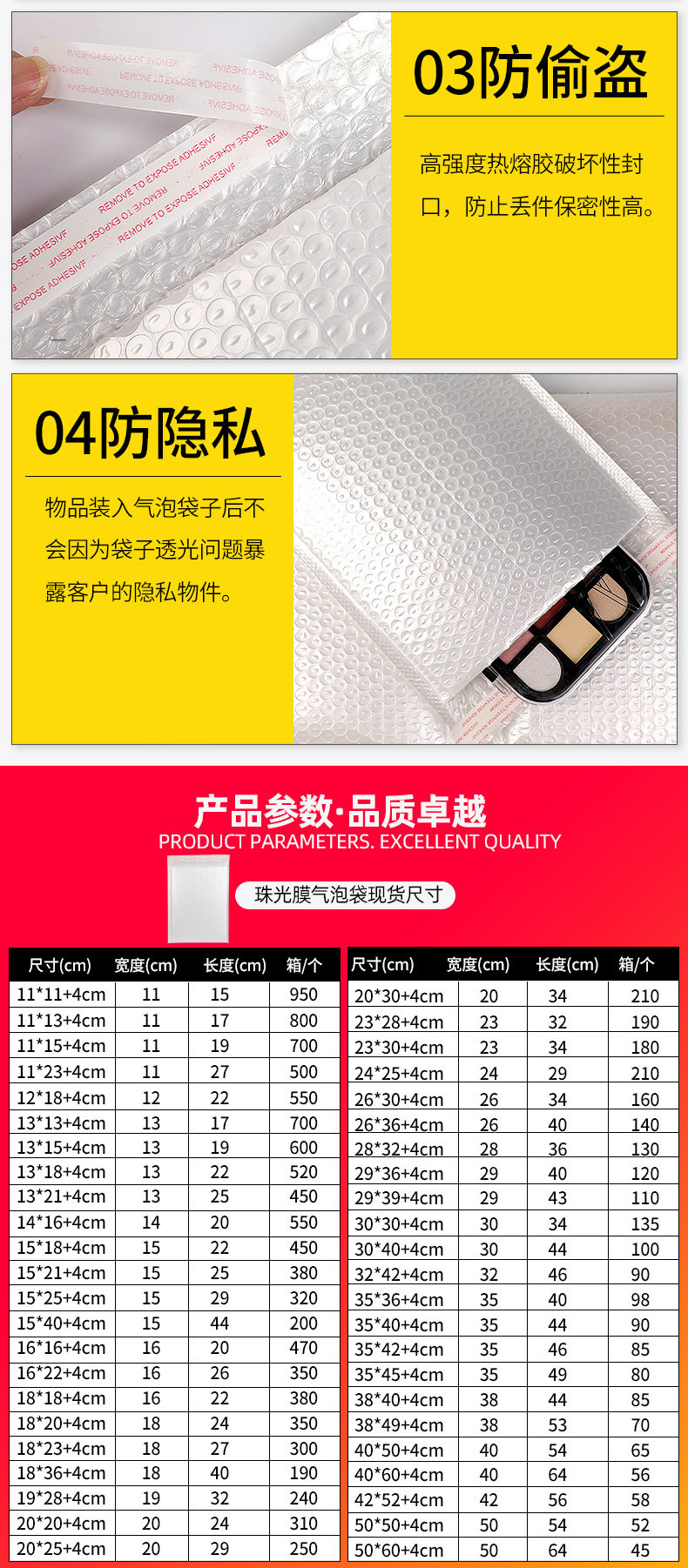 | Specifications and models | Composite pearlescent film bubble bag (1); This link is the unit price of 1 bag, please place an order according to the number of the whole box, thank you.,Composite pearlescent film bubble bag (1); Please take 950 pictures of 11*11 4cm whole box,Composite pearlescent film bubble bag (1);11*13 4cm whole box please take 800,Composite pearlescent film bubble bag (1); Please take 700 11*15 4cm boxes,Composite pearlescent film bubble bag (1);11*23 4cm whole box please take 500,Composite pearlescent film bubble bag (1); Please take 550 12*18 4cm boxes,Composite pearl film bubble bag (1); Please take 700 13*13 4cm boxes,Composite pearlescent film bubble bag (1); Please take 600 13*15 4cm boxes,Composite pearlescent film bubble bag (1); Please take 520 13*18 4cm boxes,Composite pearlescent film bubble bag (1); Please take 450 13*21 4cm boxes,Composite pearlescent film bubble bag (1); Please take 550 14*16 4cm boxes,Composite pearlescent film bubble bag (1); Please take 450 pictures of 15*18 4cm whole box,Composite pearlescent film bubble bag (1); Please take 380 pictures of 15*21 4cm whole box,Composite pearl film bubble bag (1); Please take 320 15*25 4cm boxes,Composite pearlescent film bubble bag (1); Please take 200 pictures of 15*40 4cm whole box,Composite pearlescent film bubble bag (1); Please take 470 16*16 4cm boxes,Composite pearlescent film bubble bag (1); Please take 350 16*22 4cm boxes,Composite pearl film bubble bag (1); Please take 380 18*18 4cm boxes,Composite pearlescent film bubble bag (1); Please take 350 18*20 4cm boxes,Composite pearlescent film bubble bag (1); Please take 300 pictures of 18*23 4cm whole box,Composite pearlescent film bubble bag (1); Please take 190 18*36 4cm boxes,Composite pearl film bubble bag (1); Please take 240 19*28 4cm boxes,Composite pearlescent film bubble bag (1); Please take 310 20*20 4cm boxes,Composite pearl film bubble bag (1); Please take 250 20*25 4cm boxes,Composite pearlescent film bubble bag (1); Please take 210 20*30 4cm boxes,Composite pearlescent film bubble bag (1);23*28 4cm whole box please take 190,Composite pearlescent film bubble bag (1);23*30 4cm whole box please take 180,Composite pearlescent film bubble bag (1); Please take 210 24*25 4cm boxes,Composite pearlescent film bubble bag (1); Please take 160 26*30 4cm boxes,Composite pearlescent film bubble bag (1); Please take 140 pictures of 26*36 4cm whole box,Composite pearlescent film bubble bag (1);28*32 4cm whole box please take 130,Composite pearlescent film bubble bag (1); Please take 120 pictures of 29*36 4cm whole box,Composite pearlescent film bubble bag (1); Please take 135 30*30 4cm boxes,Composite pearl film bubble bag (1); Please take 100 30*40 4cm boxes,Composite pearlescent film bubble bag (1);32*42 4cm full box please take 90,Composite pearlescent film bubble bag (1); Please take 98 35*36 4cm boxes,Composite pearl film bubble bag (1); Please take 90 35*40 4cm boxes,Composite pearl film bubble bag (1); Please take 85 35*42 4cm boxes,Composite pearlescent film bubble bag (1); Please take 80 35*45 4cm boxes,Composite pearl film bubble bag (1); Please take 85 38*40 4cm boxes,Composite pearl film bubble bag (1); Please take 70 38*49 4cm boxes,Composite pearlescent film bubble bag (1); Please take 65 40*50 4cm boxes,Composite pearl film bubble bag (1); Please take 56 40*60 4cm boxes,Composite pearlescent film bubble bag (1); Please take 58 42*52 4cm boxes,Composite pearl film bubble bag (1); Please take 52 50*50 4cm boxes,Composite pearl film bubble bag (1); Please take 45 50*60 4cm boxes |