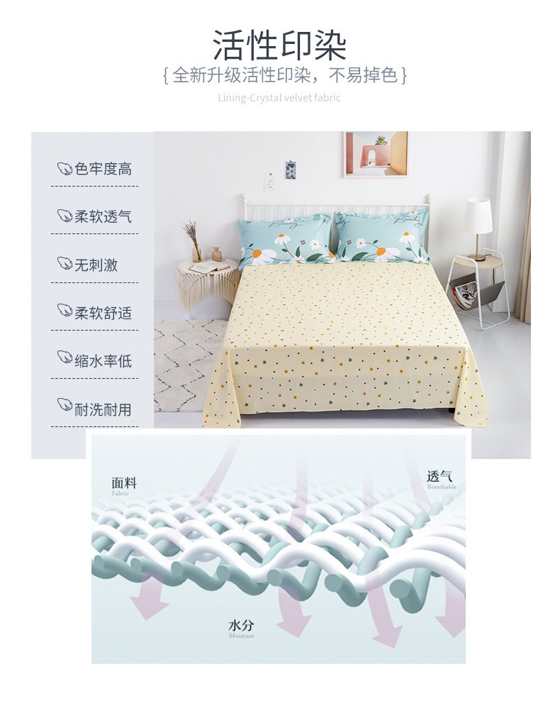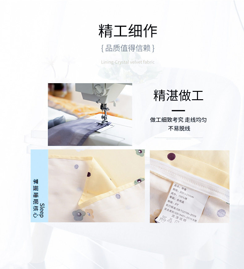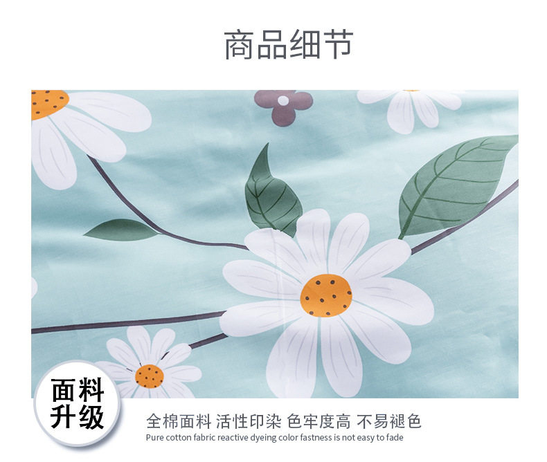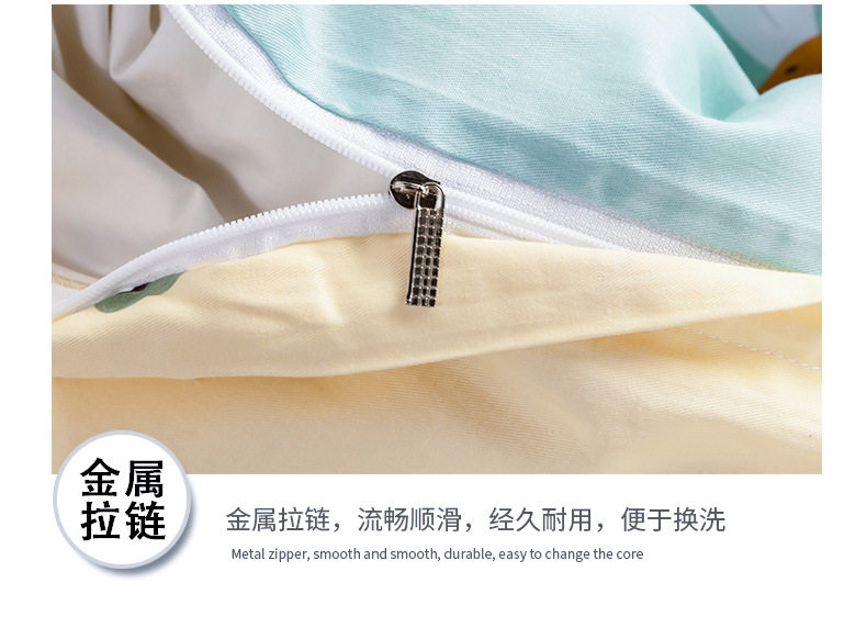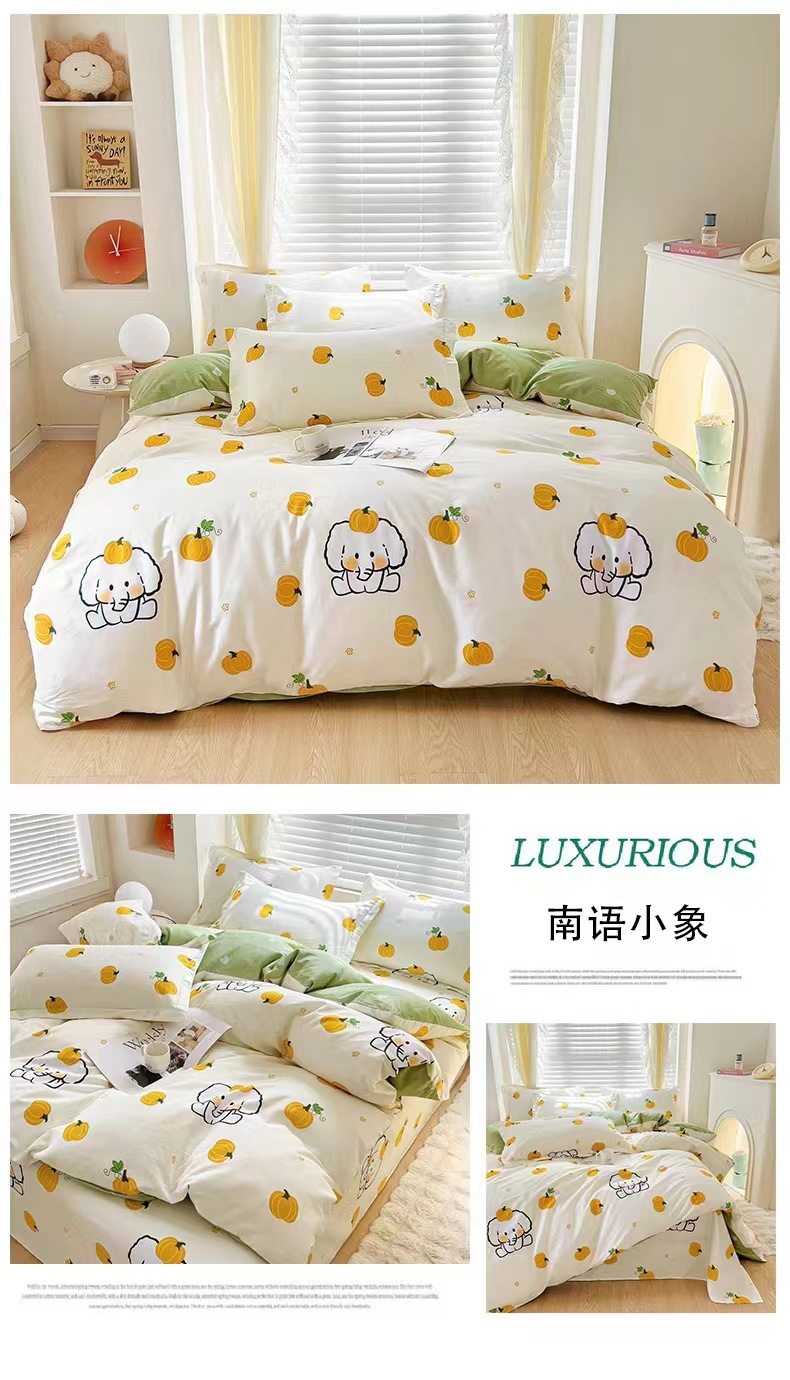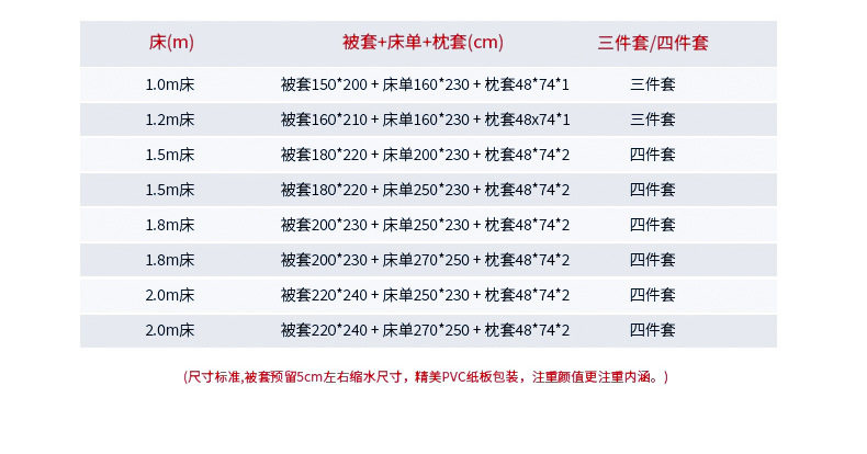 | Dimensions | Quilt cover 160x210 + sheets 160x230 + 1 pillowcase (three-piece set),Quilt cover 180x220+sheets 200x230+2 pillowcases (set of four),Quilt cover 200x230+sheets 250x230+2 pillowcases (set of four),Quilt cover 220x240+sheets 270x250+2 pillowcases (set of four),0.9 bed: fitted sheet 0.9x2.0+quilt cover 150x200+1 pillowcase (three-piece set),1.2 beds: fitted sheet 120x200+quilt cover 160x210+1 pillowcase (three-piece set),1.5 bed: fitted sheet 150x200+quilt cover 180x220+2 pillowcases (set of four),1.5 beds: fitted sheet 150x200+quilt cover 200x230+2 pillowcases (set of four),1.8 bed: fitted sheet 180x220+quilt cover 200x230+2 pillowcases (set of four),2.0 bed: fitted sheet 200x220+quilt cover 220x240+2 pillowcases (set of four) |
