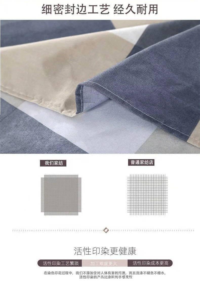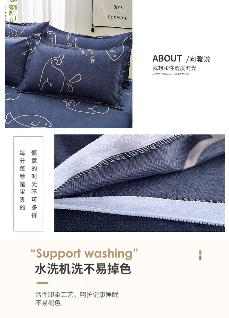 | Dimensions | Pillowcase (43*68),110*230 (sheets),120*230 (sheets),150*230 (sheets),200*230 (sheets),230*230 (sheets),250*230 (sheets),150*220 (quilt cover),200*220 (quilt cover),120cm (bed sheet pillowcase) two pieces,150cm (bed sheet pillowcase) two pieces,120cm (bed sheet, quilt cover, pillowcase) three pieces,150cm (bed sheet, quilt cover, pillowcase) three pieces |