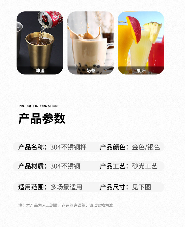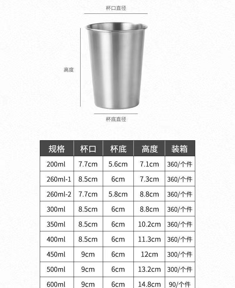 | Color | 304 single layer cup 200ml (silver),304 single layer cup 260ml (silver),304 single layer cup 300ml (silver),304 single layer cup 350ml (silver),304 single layer cup 400ml (silver),304 single layer cup 450ml (silver),304 single layer cup 500ml (silver),304 single layer cup 600ml (silver),304 single layer cup 200ml (gold),304 single layer cup 260ml (gold),304 single layer cup 300ml (gold),304 single layer cup 350ml (gold),304 single layer cup 400ml (gold),304 single layer cup 450m (gold),304 single layer cup 500ml (gold),304 single layer cup 600ml (gold),Cup lid + straw (single shot will not be issued) |