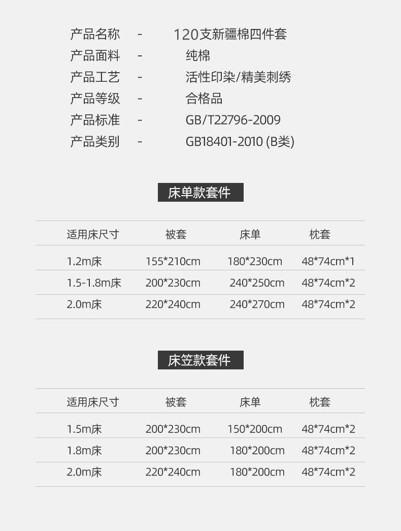 | Dimensions | 1.2m bed sheet style [quilt cover: 155*210cm] three-piece set,1.5m bed sheet style [quilt cover: 200*230cm] four-piece set,1.8m bed sheet style [quilt cover: 200*230cm] four-piece set,2.0m bed sheet style [quilt cover: 220*240cm] four-piece set,1.5m fitted sheet [quilt cover: 200*230cm] four-piece set,1.8m fitted sheet [quilt cover: 200*230cm] four-piece set |