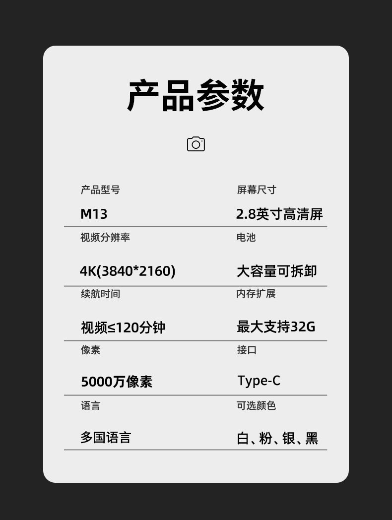 | Body color | Black,White camera + 32g memory card,Silver,Pink,Camera black + 32g memory card,White,Camera silver + 32g memory card,Camera pink + 32g memory card,Camera black + 64g memory card,Camera white + 64g memory card,Camera silver + 64g memory card,Camera pink + 64g memory card |