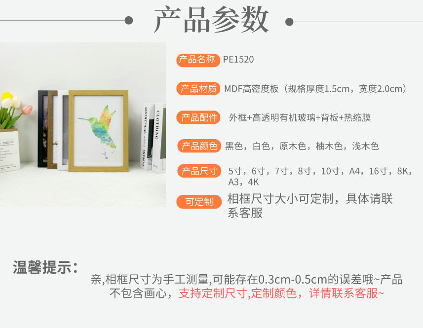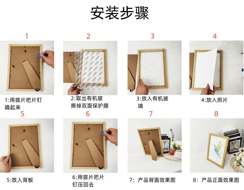 | Inner frame size | 5inch (8.9*12.7cm) table setting,6inch (10.1*15.2cm) hanging,7inch (12.7*17.8cm) hanging,8inch (15.2*20.3cm) hanging,10inch (20.3*25.4cm) hanging,A4 (21*29.7cm) hanging,A3 (29.7*42cm) wall hanging,16inch (30*40cm) wall hanging,8k (26.6*38cm) wall hanging,4k (38*53cm) wall hanging |