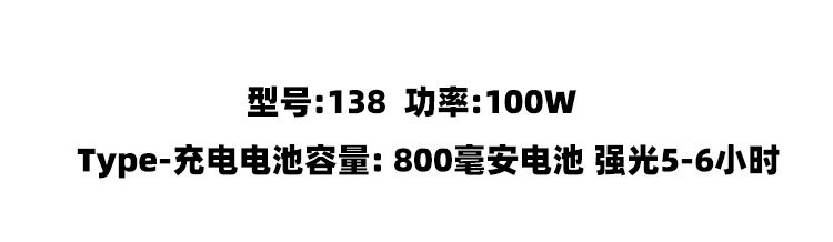 | Color | 139A# 50W,516#100W,8003# Strong light for 8-10 hours laser cannon chip,Black 138#-50w (18650 battery),1046-50w (14500 battery) 5cm lamp holder plastic box package with charger,G852,4616 a # 100w with data cable,4601 100w single battery 5cm strong light for 6 hours,1046c with data cable-50w (14500 battery),1046b-50w (18650 battery) 5cm lamp head plastic box package with charger,203-50w 5cm lamp head plastic box package with charger,1846 100w (6 hours of battery life) 5cm lamp head, plastic box packaging with charger,4605 200w dual battery 5cm strong light for 8-10 hours,5205 300w dual battery 6cm strong light for 8-10 hours,4606 120w single battery 5cm lamp head, strong light for 6 hours,5206 150 dual lithium battery 5.5cm lamp head, strong light for 6-8 hours,7802 120w single battery 8cm lamp head strong light 6h,7601 (plastic cup) 80w single battery 8cm strong light 4-6 hours,4615a high-brightness lamp beads, strong light for 10 hours,5215 laser cannon lamp beads, strong light for 10 hours,6815 laser cannon lamp beads, strong light for 10 hours,A98 120w (xpg chip) dual lithium battery 6.5cm strong light for 10 hours,A99 300w (t6 chip) power display, dual lithium battery, 8cm strong light for 10 hours,A20 400w (p50 chip) triple lithium battery 10cm strong light for 10 hours,1278-150w (12 hours of battery life, dual lithium batteries, 8cm lamp heads, plastic box packaging with charger,2202 50w single lithium battery 5cm lamp head plastic box charger strong light for 8 hours,1078 100w (6 hours of battery life) dual lithium battery 8cm lamp head plastic box packaging with charger,A46# 80w camouflage lighting 10h,4605 black 150w dual lithium battery 5cm lamp head, strong light for 6-8 hours,A99 300w yellow light (t6 chip) power display, dual lithium battery, 8cm strong light for 10 hours,581#200w distribution line, strong light for 6-8 hours, large spot laser cannon,581#200w with charger, strong light for 6-8 hours, large spot laser cannon,582# 200w large spot laser cannon dual lithium battery, strong light for 15 hours, with charger,786# 200w strong light 24 hours,591# 150w strong light 6-10h with data cable,592# 200w strong light 6-8h with data cable,585# 300w strong light 8-10h,586# 300w strong light 10-12h,996#200w strong light 6h,5228#150w strong light 6h,6828#200w strong light 6h,5216/587#Laser cannon strong light for 10 hours,6816#Laser cannon strong light for 10 hours,5208# 200w lighting 10-15h,6808# 300w lighting 10-15h,5216 type-c fast charging with power display dual lithium battery,6816 type-c fast charging with power display dual lithium battery,4601 black 100w single battery 5cm strong light for 6 hours,5205 black 300w dual battery 6cm strong light for 8-10 hours,4618 100w distribution wire,595#1000W,596#2000W,598#3000W,598 # 3000w yellow light |