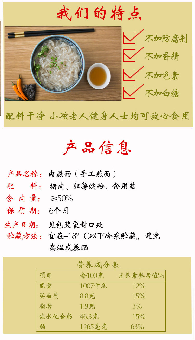 | Raw materials and ingredients | Pork, edible starch, edible salt, sodium carbonate |