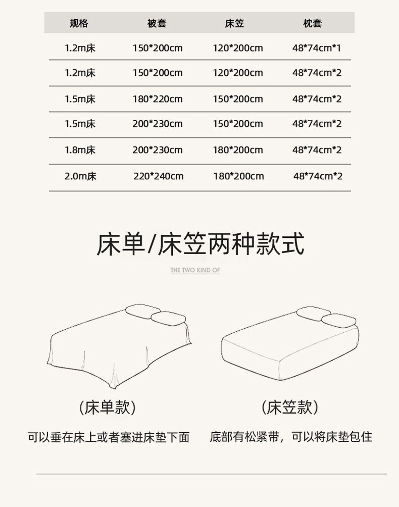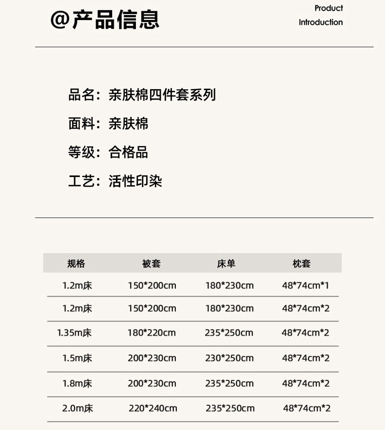 | Size specifications | 1.2m bed sheet three-piece set (quilt cover 150x200),1.2m bed sheet four-piece set (quilt cover 150x200cm),1.5m bed sheet four-piece set (quilt cover 150x200),1.5m bed sheet four-piece set (quilt cover 180x220),1.5m bed sheet four-piece set (quilt cover 200x230),1.8m bed sheet four-piece set (quilt cover 200x230),2.0m bed sheet four-piece set (quilt cover 220x240),1.2m (fitted sheet) three-piece set-quilt cover 150x200,1.2m (fitted sheet) four-piece set-quilt cover 150x200,1.5m (fitted sheet) four-piece set-quilt cover 180x220,1.5m (fitted sheet) four-piece set-quilt cover 200x230,1.8m (fitted sheet) four-piece set-quilt cover 200x230,1.8m (fitted sheet) four-piece set-quilt cover 220x240 |