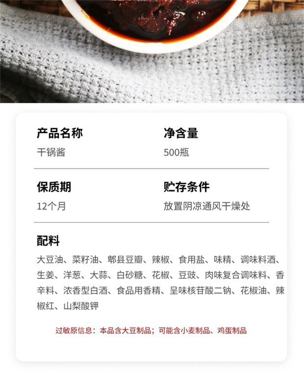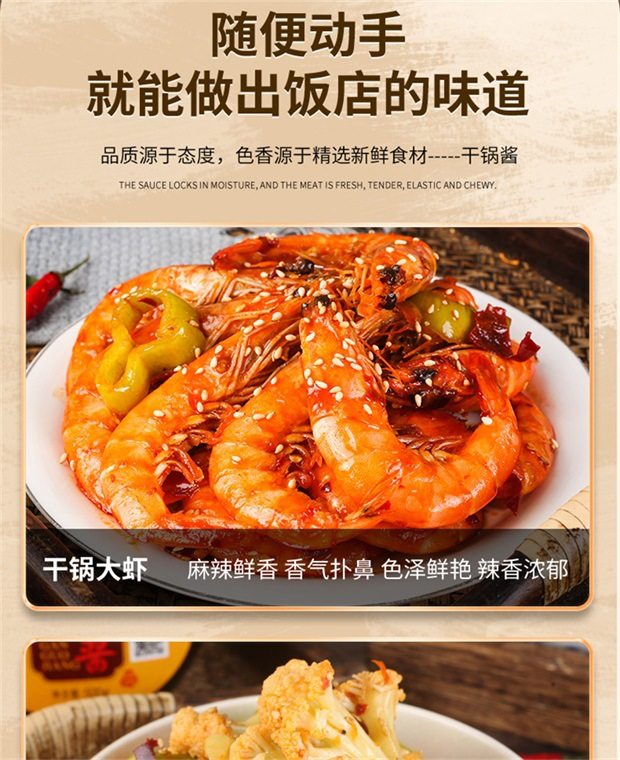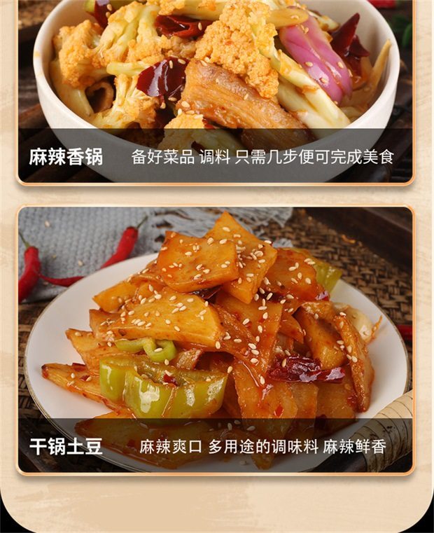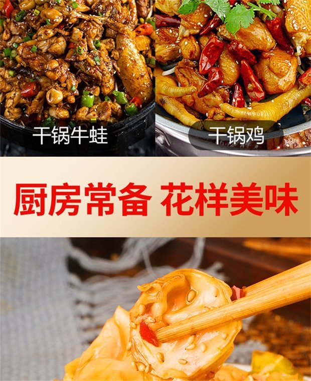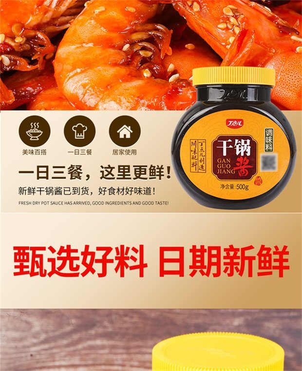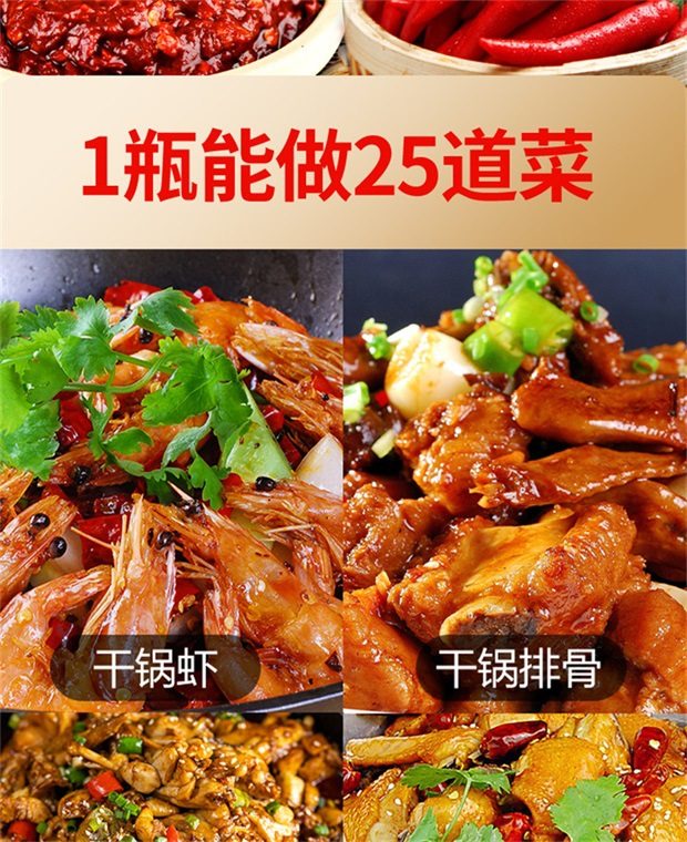| Packaging specifications | 500g [spicy] dry pot sauce [99% of people bought it],[spicy] discounted price 500gx2 bottles,[spicy] super affordable 500gx4 bottles,Wholesale price for a full box of 8 bottles [full box discount],460g xiangguo sauce [spicy and fragrant],460g golden soup pickled cabbage sauce [hot and sour golden soup],800g dry pot sauce,1kg dry pot incense,1kg hot and sour noodles,1kg spicy chicken fresh,800g fresh pepper and sesame chicken,425 pepper and sesame chicken juice,500g hot and sour noodles,500g dry pot incense,500g spicy chicken,[not spicy] xiangguo sauce 500gx1 bottle,[0 added] dry pot sauce 500gx1 bottle,[spicy] dry pot sauce 150gx1 bottle,[not spicy] xiangguo sauce 150gx1 bottle,[spicy + not spicy] 1 bottle each of 150g dry pot sauce + fragrant pot sauce,[spicy + not spicy] 500g dry pot sauce + 1 bottle each of fragrant pot sauce,[not spicy] xiangguo sauce 150gx2 bottles,[spicy] dry pot sauce 150gx2 bottles |