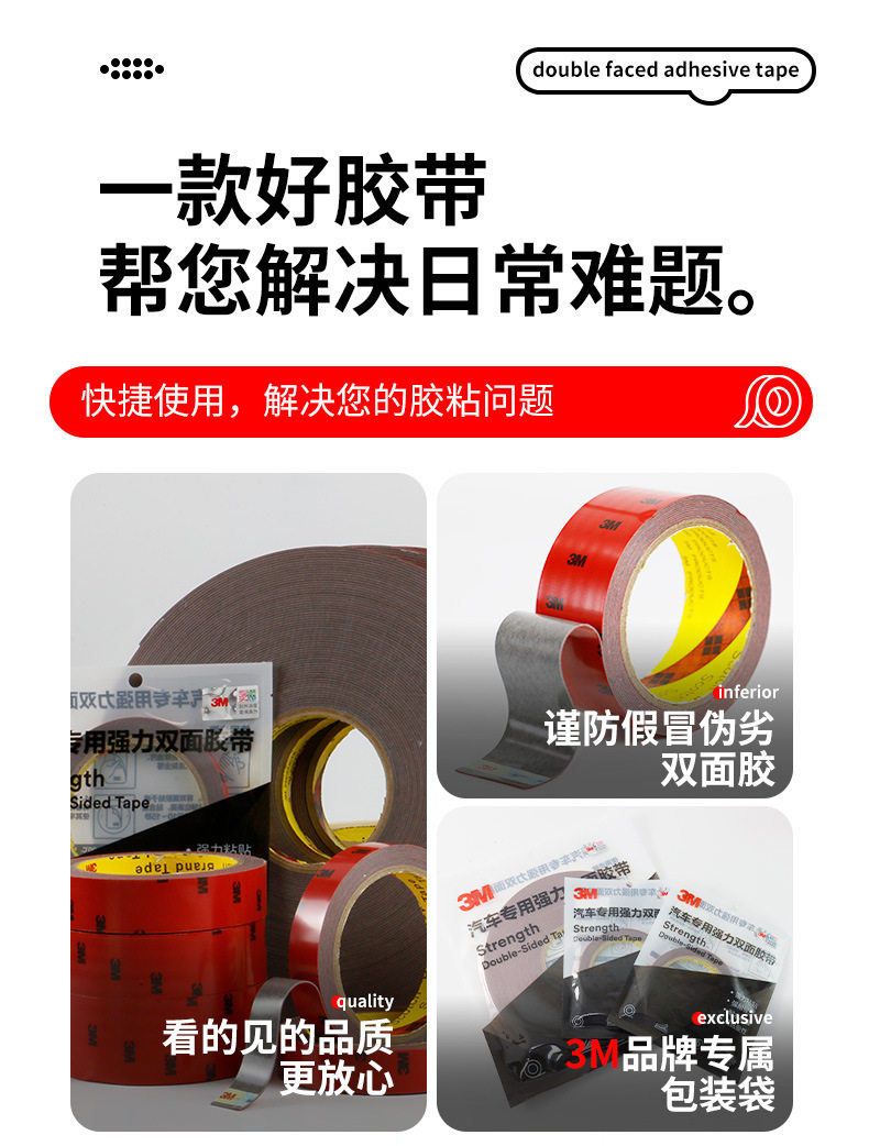 | Specifications and models | 6mm * 3m;3M5608(0.8mm thick gray glue),6mm * 3m;3M5108(0.8mm thick gray glue),6mm * 3m;3M4229(0.8mm thick gray glue),8mm * 3m;3M5608(0.8mm thick gray glue),8mm * 3m;3M5108(0.8mm thick gray glue),8mm * 3m;3M4229(0.8mm thick gray glue),8mm * 3m;3M5952(1.1mm thick vinyl),10mm * 3m;3M5608(0.8mm thick gray glue),10mm * 3m;3M5108(0.8mm thick gray glue),10mm * 3m;3M4229(0.8mm thick gray glue),10mm * 3m;3M5952(1.1mm thick vinyl),12mm * 3m;3M5608(0.8mm thick gray glue),12mm * 3m;3M5108(0.8mm thick gray glue),12mm * 3m;3M4229(0.8mm thick gray glue),15mm * 3m;3M5608(0.8mm thick gray glue),15mm * 3m;3M5108(0.8mm thick gray glue),15mm * 3m;3M4229(0.8mm thick gray glue),15mm * 3m;3M5952(1.1mm thick vinyl),20mm * 3m;3M5608(0.8mm thick gray glue),20mm * 3m;3M5108(0.8mm thick gray glue),20mm * 3m;3M4229(0.8mm thick gray glue),20mm * 3m;3M5952(1.1mm thick vinyl),30mm * 3m;3M5608(0.8mm thick gray glue),30mm * 3m;3M5108(0.8mm thick gray glue),30mm * 3m;3M4229(0.8mm thick gray glue),30mm * 3m;3M5952(1.1mm thick vinyl),6mm * 33m;3M5608(0.8mm thick gray glue),6mm * 33m;3M5108(0.8mm thick gray glue),6mm * 33m;3M4229(0.8mm thick gray glue),6mm * 33m;3M5952(1.1mm thick vinyl),8mm * 33m;3M5608(0.8mm thick gray glue),8mm * 33m;3M5108(0.8mm thick gray glue),8mm * 33m;3M4229(0.8mm thick gray glue),8mm * 33m;3M5952(1.1mm thick vinyl),10mm * 33m;3M5608(0.8mm thick gray glue),10mm * 33m;3M5108(0.8mm thick gray glue),10mm * 33m;3M4229(0.8mm thick gray glue),10mm * 33m;3M5952(1.1mm thick vinyl),12mm * 33m;3M5608(0.8mm thick gray glue),12mm * 33m;3M5108(0.8mm thick gray glue),12mm * 33m;3M4229(0.8mm thick gray glue),12mm * 33m;3M5952(1.1mm thick vinyl),15mm * 33m;3M5608(0.8mm thick gray glue),15mm * 33m;3M5108(0.8mm thick gray glue),15mm * 33m;3M4229(0.8mm thick gray glue),15mm * 33m;3M5952(1.1mm thick vinyl),20mm * 33m;3M5608(0.8mm thick gray glue),20mm * 33m;3M5108(0.8mm thick gray glue),20mm * 33m;3M4229(0.8mm thick gray glue),20mm * 33m;3M5952(1.1mm thick vinyl) |