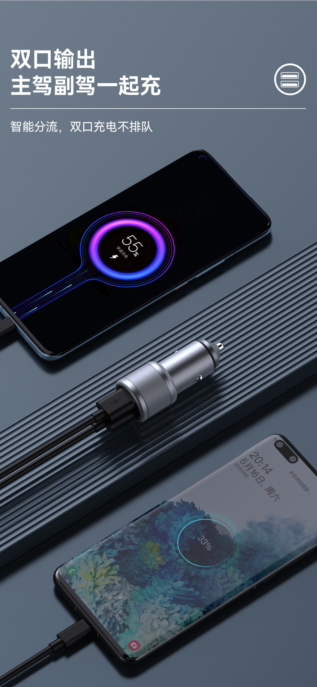 Metal 160W Super Fast Charging Dual USB Car Charger Multi-Function Car Charger Adapter Universal for Mobile Phones