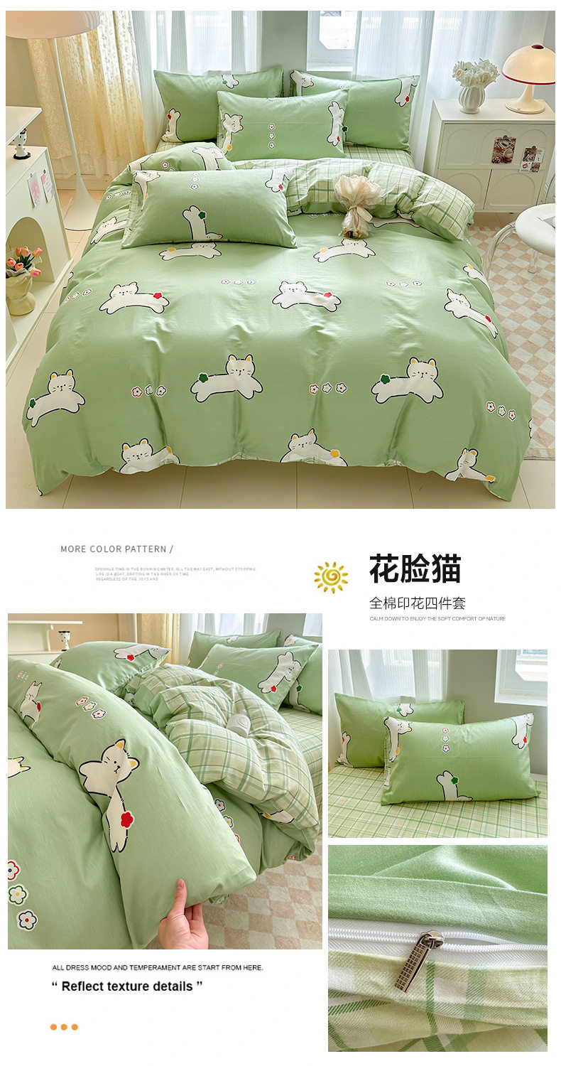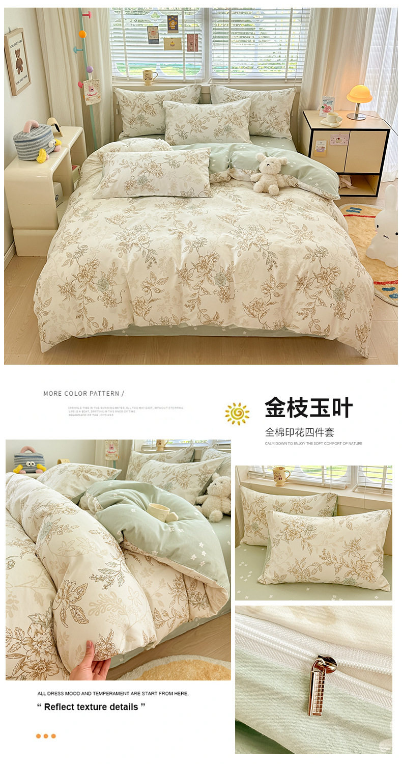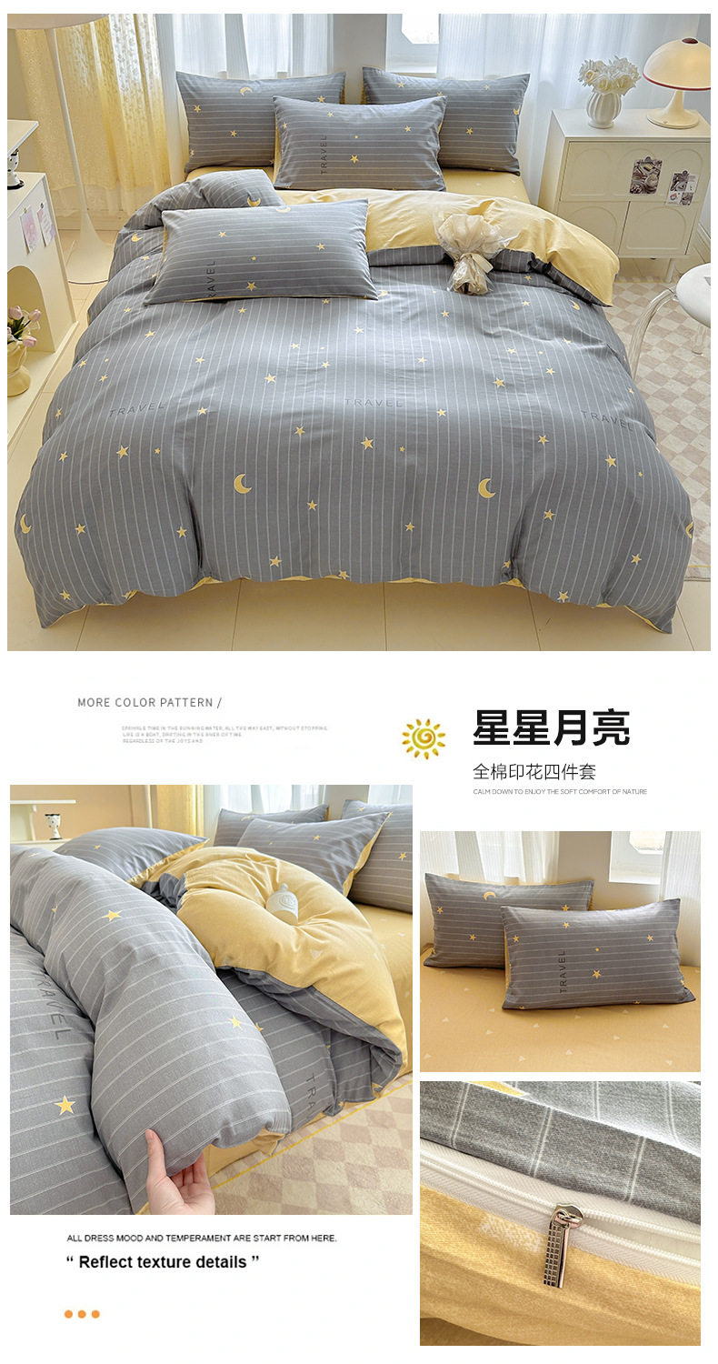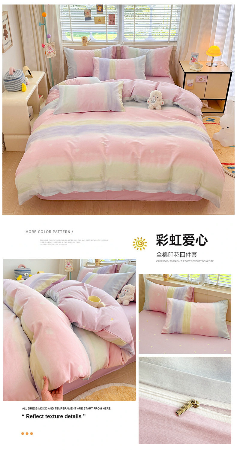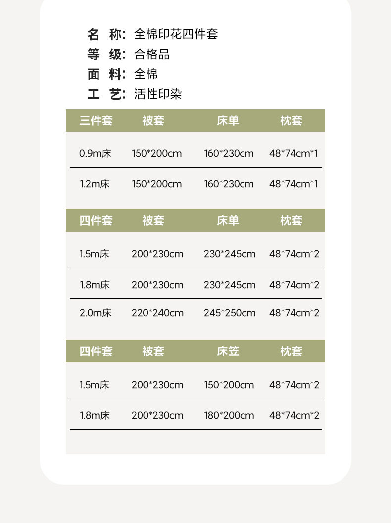 | Dimensions | 0.9m (student dormitory bed) three-piece bed sheet set [quilt cover 150*200+bed sheet+pillowcase],1.2m three-piece bed sheet set [quilt cover 150*200+sheet+pillowcase],1.5m bed sheet four-piece set [quilt cover 200*230+sheets+2 pillowcases],1.8m bed sheet four-piece set [quilt cover 200*230+sheets+2 pillowcases],2.0m bed sheet four-piece set [quilt cover 220*240+bed sheet+2 pillowcases],1.5m fitted sheet set of four [fitted sheet 150*200+quilt cover 200*230+2 pillowcases],1.8m fitted sheet set of four [fitted sheet 180*200+quilt cover 200*230+2 pillowcases] |