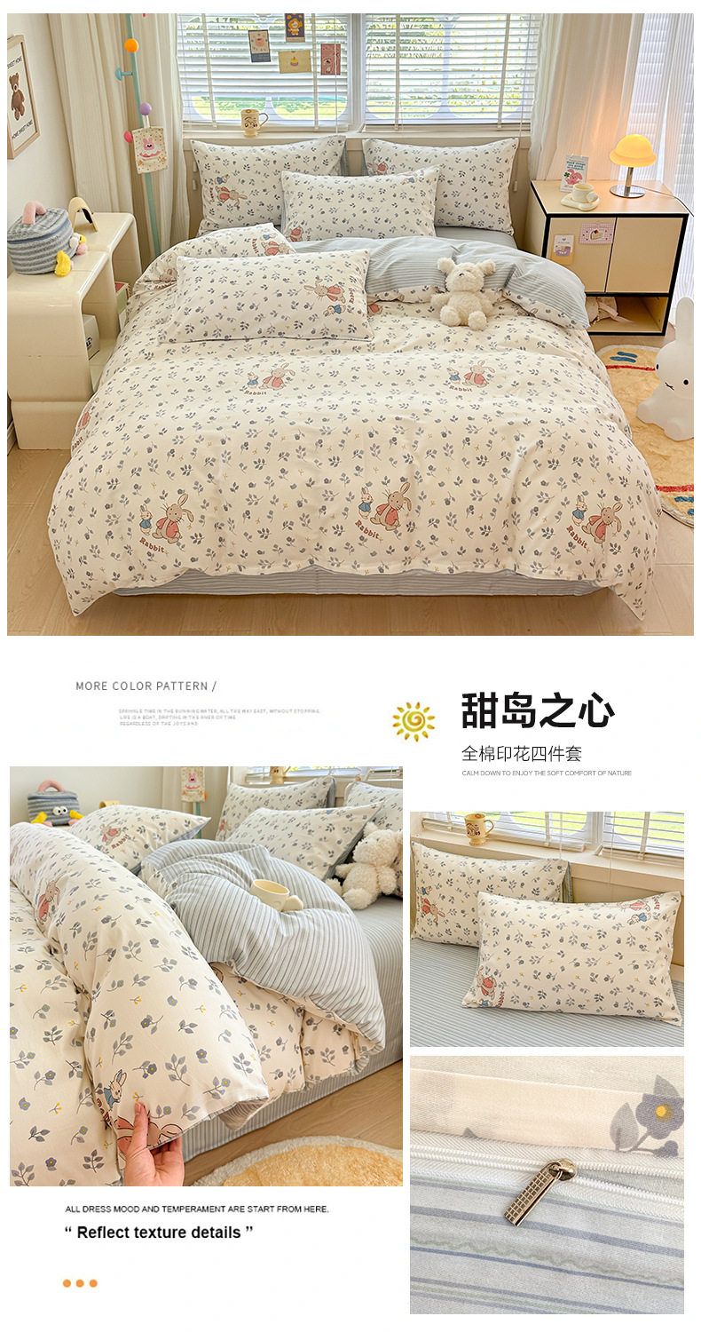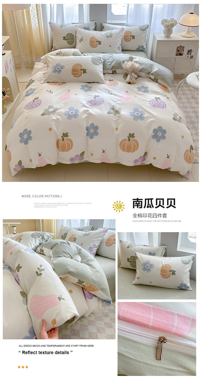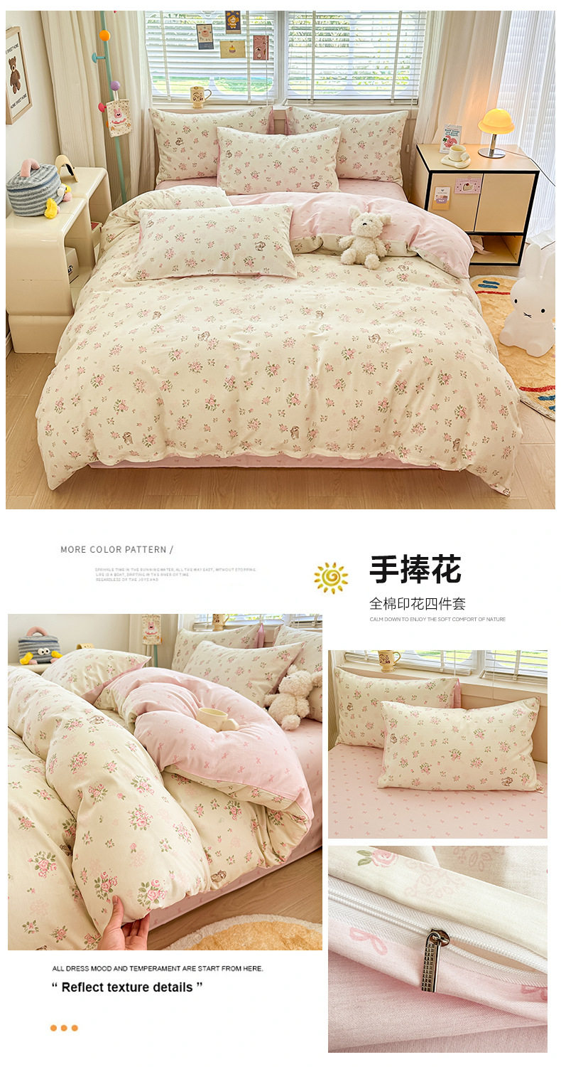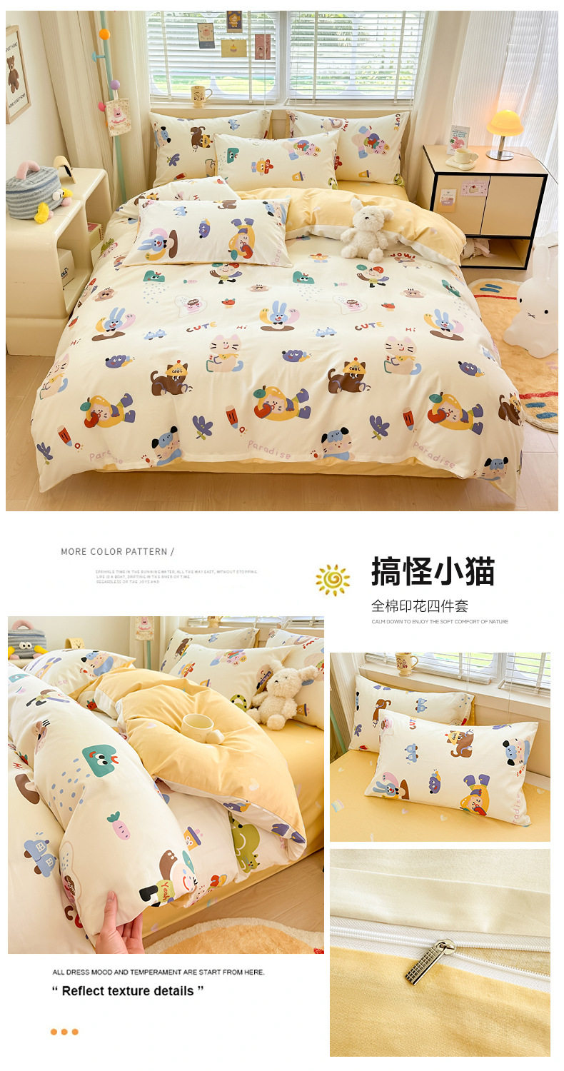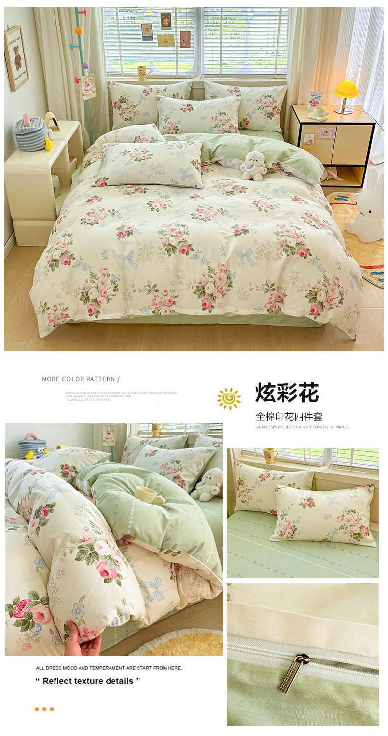 | Dimensions | 0.9m (student dormitory bed) three-piece bed sheet set [quilt cover 150*200+bed sheet+pillowcase],1.2m three-piece bed sheet set [quilt cover 150*200+sheet+pillowcase],1.5m bed sheet four-piece set [quilt cover 200*230+sheets+2 pillowcases],1.8m bed sheet four-piece set [quilt cover 200*230+sheets+2 pillowcases],2.0m bed sheet four-piece set [quilt cover 220*240+bed sheet+2 pillowcases],1.5m fitted sheet set of four [fitted sheet 150*200+quilt cover 200*230+2 pillowcases],1.8m fitted sheet set of four [fitted sheet 180*200+quilt cover 200*230+2 pillowcases] |