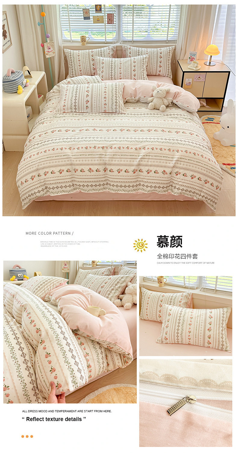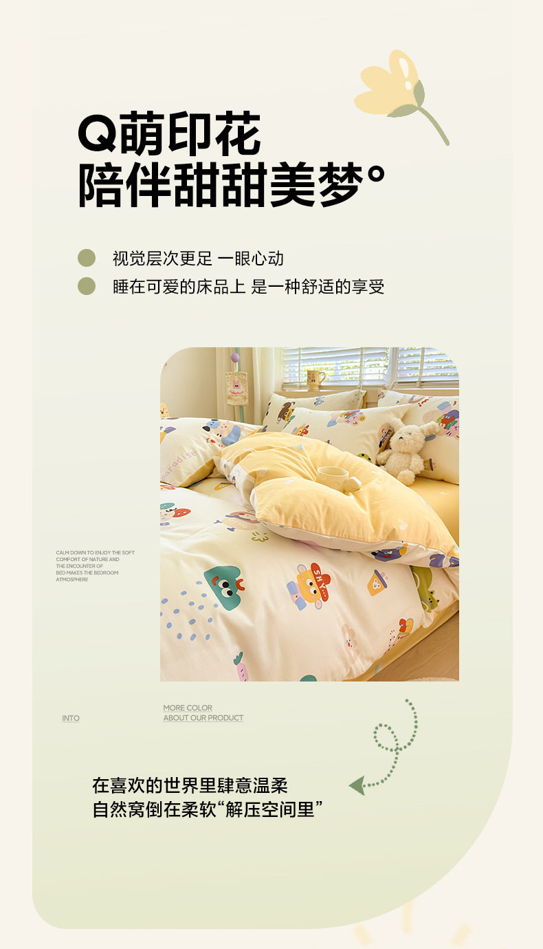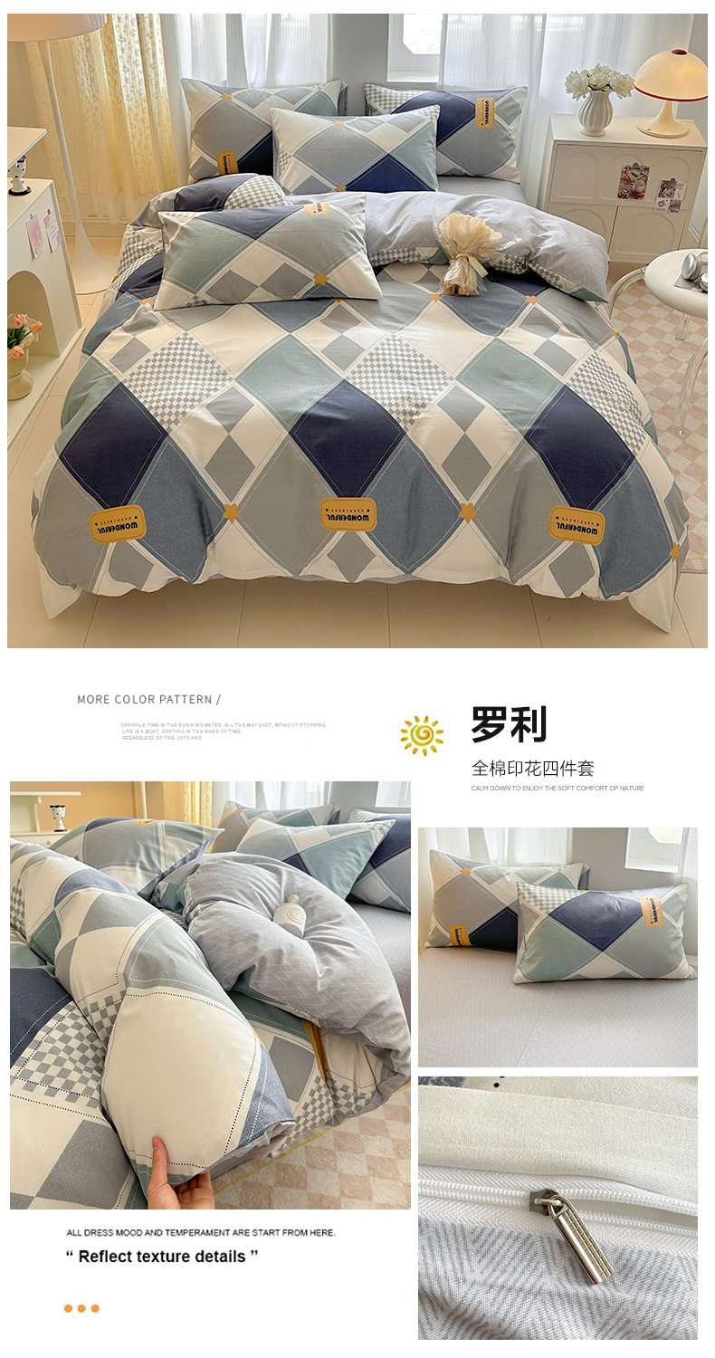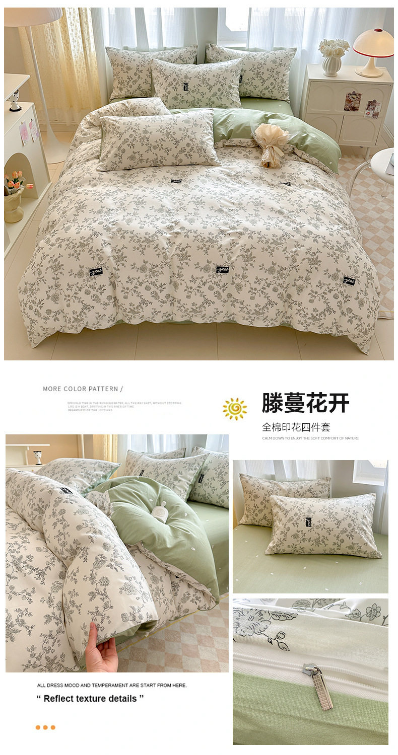 | Dimensions | 0.9m (student dormitory bed) three-piece bed sheet set [quilt cover 150*200+bed sheet+pillowcase],1.2m three-piece bed sheet set [quilt cover 150*200+sheet+pillowcase],1.5m bed sheet four-piece set [quilt cover 200*230+sheets+2 pillowcases],1.8m bed sheet four-piece set [quilt cover 200*230+sheets+2 pillowcases],2.0m bed sheet four-piece set [quilt cover 220*240+bed sheet+2 pillowcases],1.5m fitted sheet set of four [fitted sheet 150*200+quilt cover 200*230+2 pillowcases],1.8m fitted sheet set of four [fitted sheet 180*200+quilt cover 200*230+2 pillowcases] |