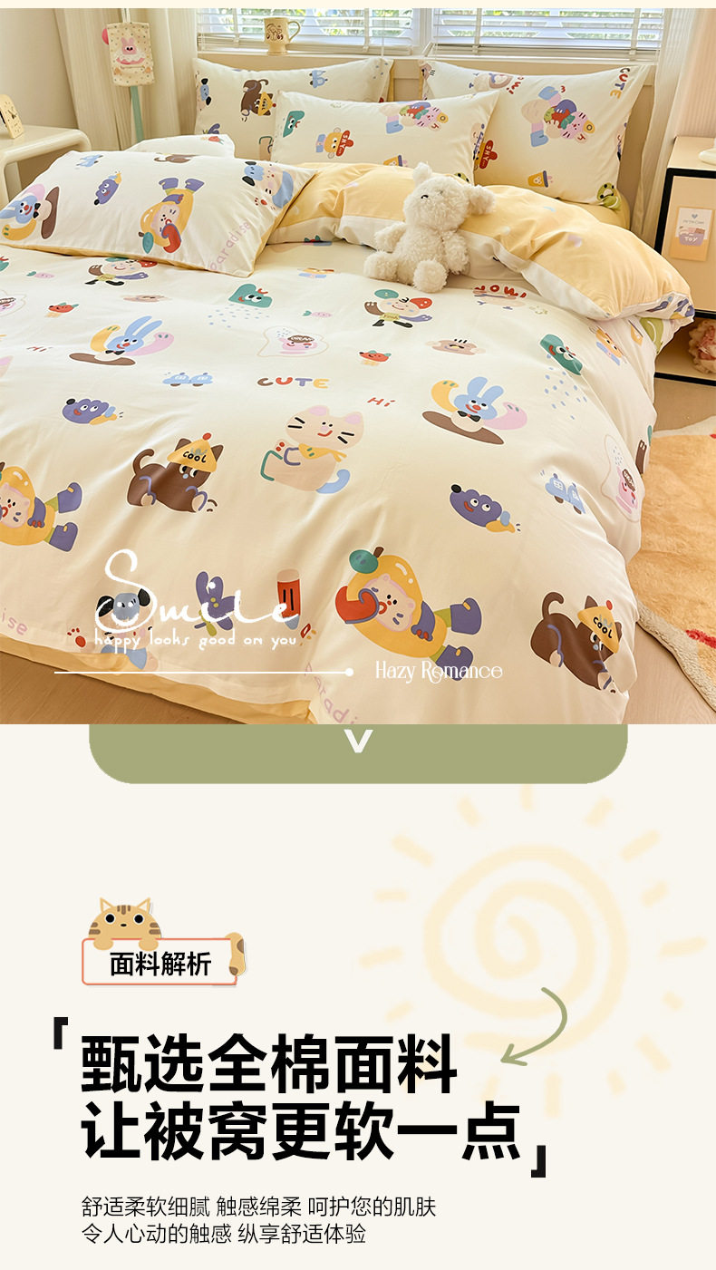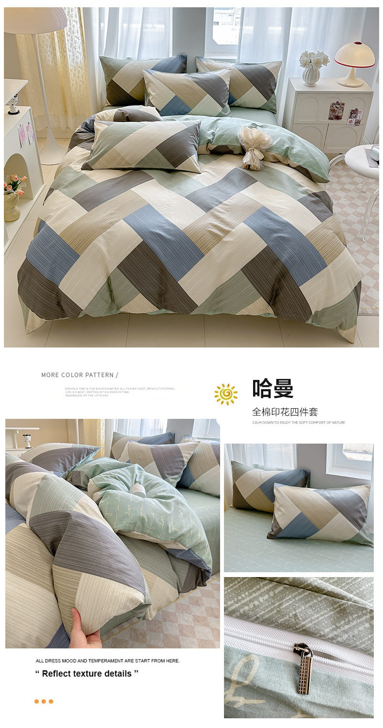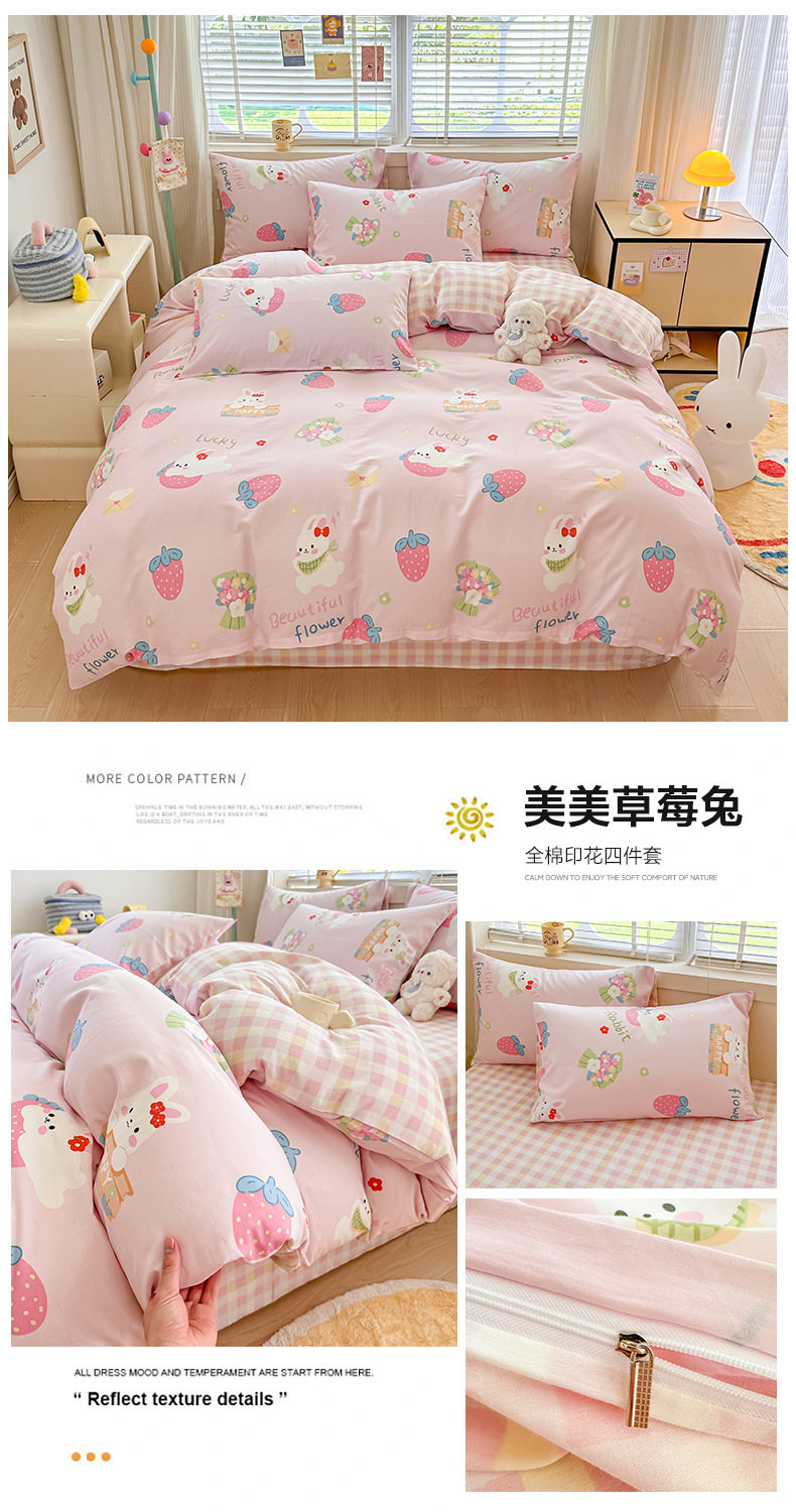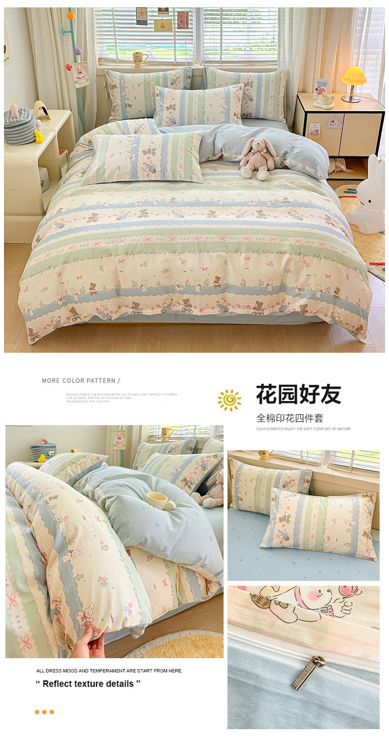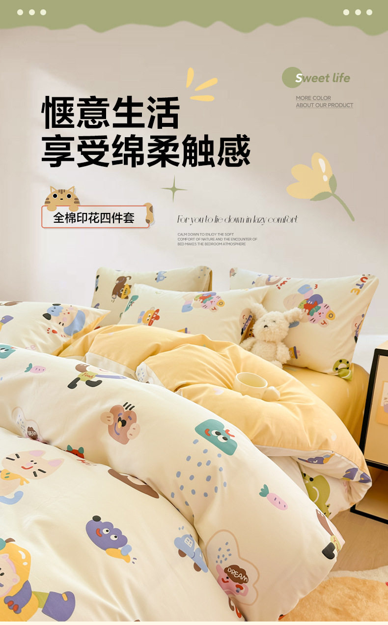 | Dimensions | 0.9m (student dormitory bed) three-piece bed sheet set [quilt cover 150*200+bed sheet+pillowcase],1.2m three-piece bed sheet set [quilt cover 150*200+sheet+pillowcase],1.5m bed sheet four-piece set [quilt cover 200*230+sheets+2 pillowcases],1.8m bed sheet four-piece set [quilt cover 200*230+sheets+2 pillowcases],2.0m bed sheet four-piece set [quilt cover 220*240+bed sheet+2 pillowcases],1.5m fitted sheet set of four [fitted sheet 150*200+quilt cover 200*230+2 pillowcases],1.8m fitted sheet set of four [fitted sheet 180*200+quilt cover 200*230+2 pillowcases] |