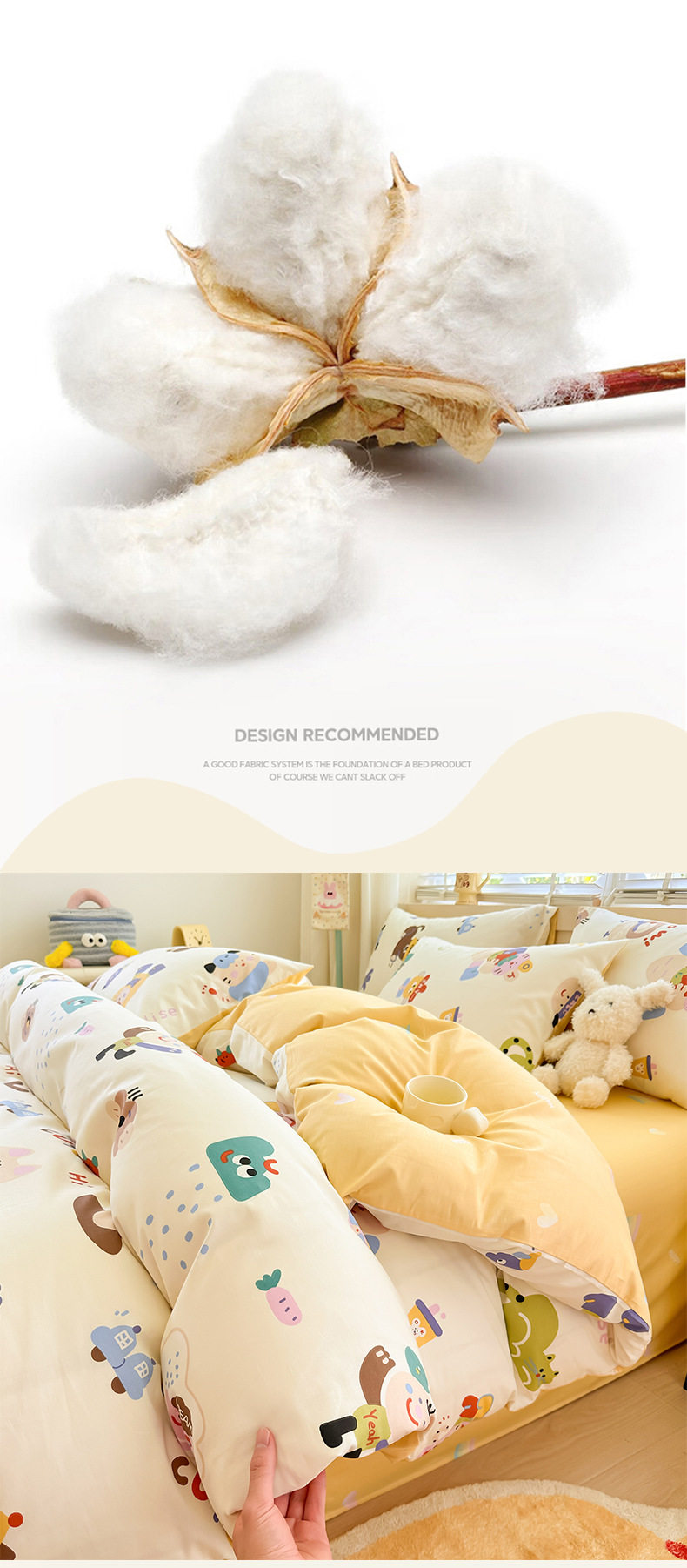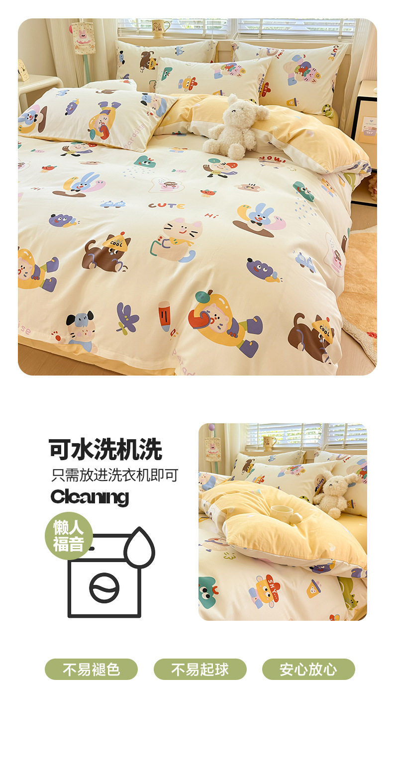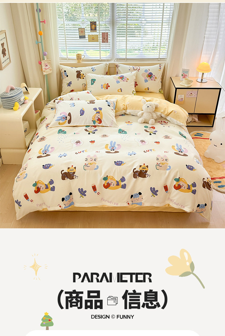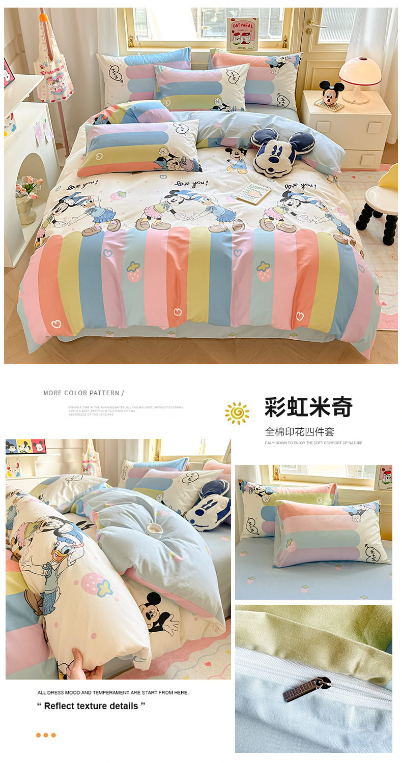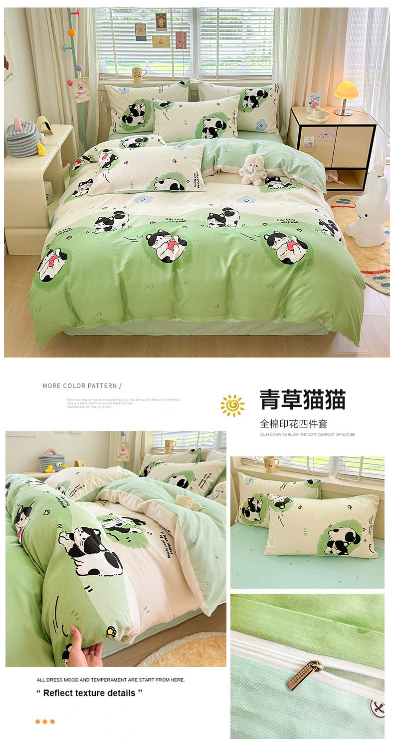 | Dimensions | 0.9m (student dormitory bed) three-piece bed sheet set [quilt cover 150*200+bed sheet+pillowcase],1.2m three-piece bed sheet set [quilt cover 150*200+sheet+pillowcase],1.5m bed sheet four-piece set [quilt cover 200*230+sheets+2 pillowcases],1.8m bed sheet four-piece set [quilt cover 200*230+sheets+2 pillowcases],2.0m bed sheet four-piece set [quilt cover 220*240+bed sheet+2 pillowcases],1.5m fitted sheet set of four [fitted sheet 150*200+quilt cover 200*230+2 pillowcases],1.8m fitted sheet set of four [fitted sheet 180*200+quilt cover 200*230+2 pillowcases] |