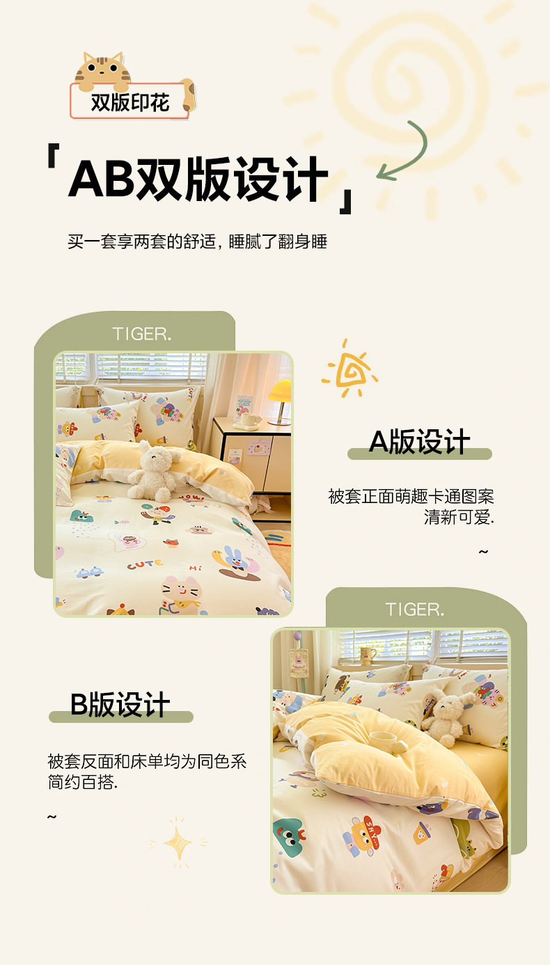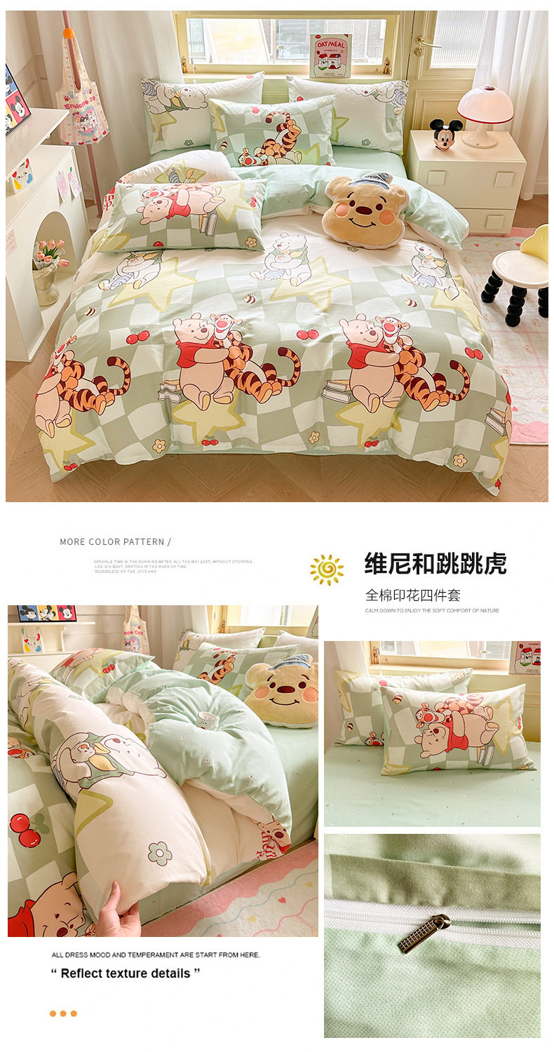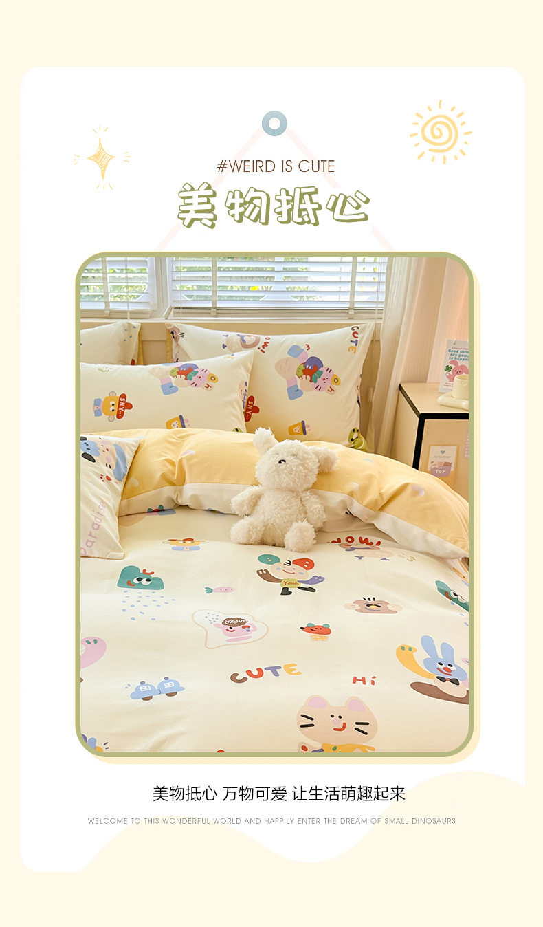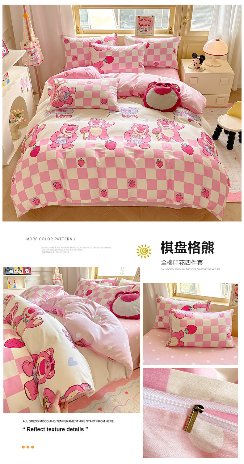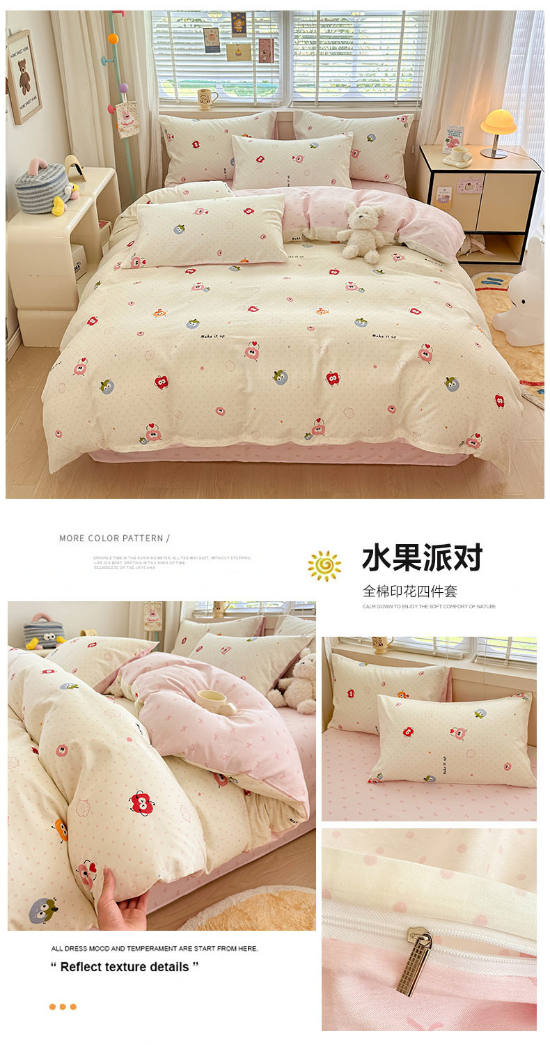 | Dimensions | 0.9m (student dormitory bed) three-piece bed sheet set [quilt cover 150*200+bed sheet+pillowcase],1.2m three-piece bed sheet set [quilt cover 150*200+sheet+pillowcase],1.5m bed sheet four-piece set [quilt cover 200*230+sheets+2 pillowcases],1.8m bed sheet four-piece set [quilt cover 200*230+sheets+2 pillowcases],2.0m bed sheet four-piece set [quilt cover 220*240+bed sheet+2 pillowcases],1.5m fitted sheet set of four [fitted sheet 150*200+quilt cover 200*230+2 pillowcases],1.8m fitted sheet set of four [fitted sheet 180*200+quilt cover 200*230+2 pillowcases] |