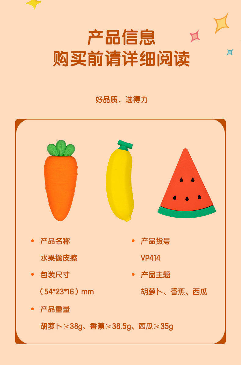 | Specifications | VP414 Carrot [single piece]],VP414 Watermelon [single piece]],VP414 Banana [single piece]] |