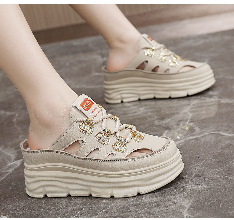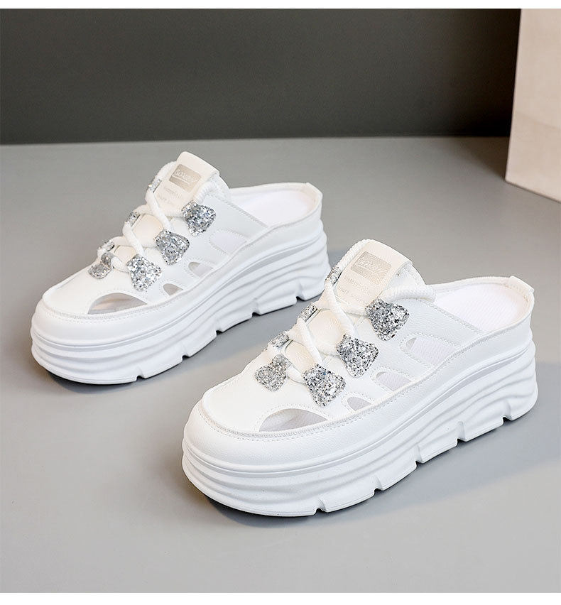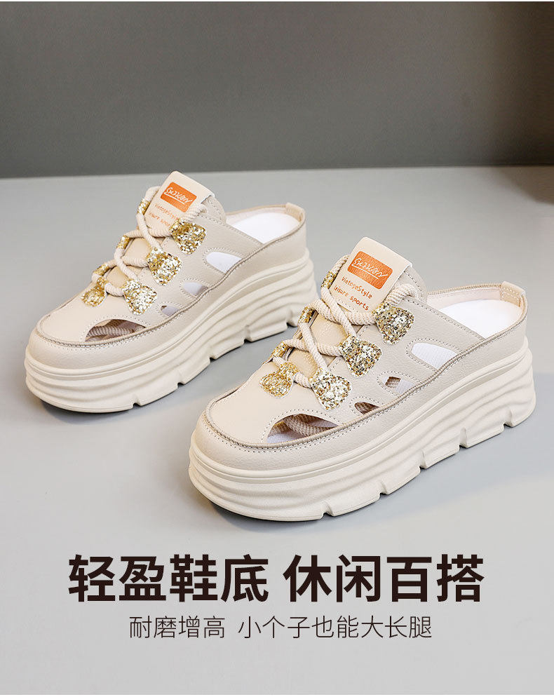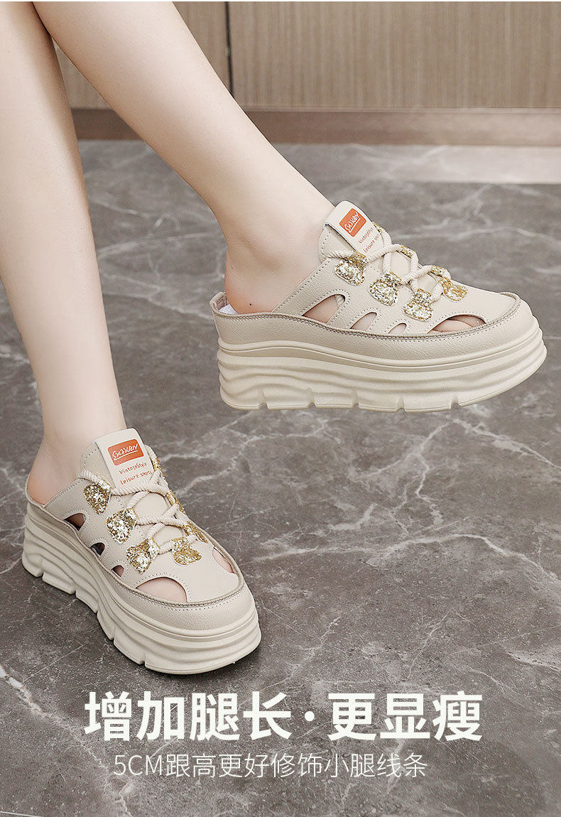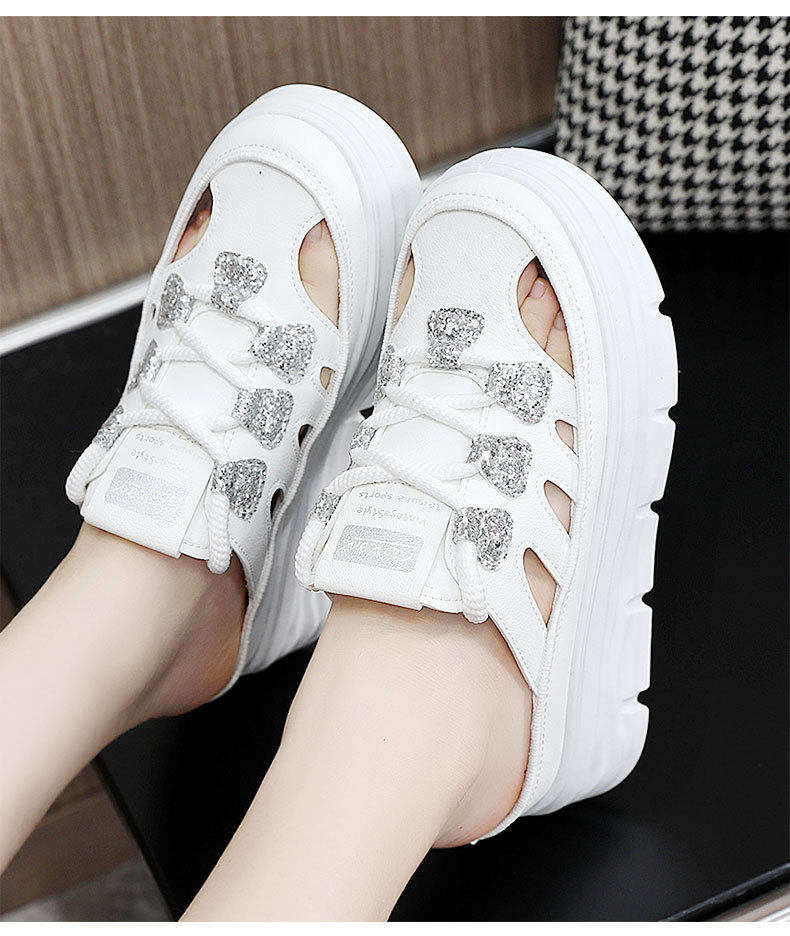 W3650 New Half-Slip Women's 2024 Summer Cut Out Heightening White Shoes Thick-Soled Casual Shoes Women's Sandals Breathable
