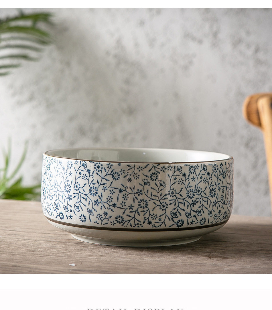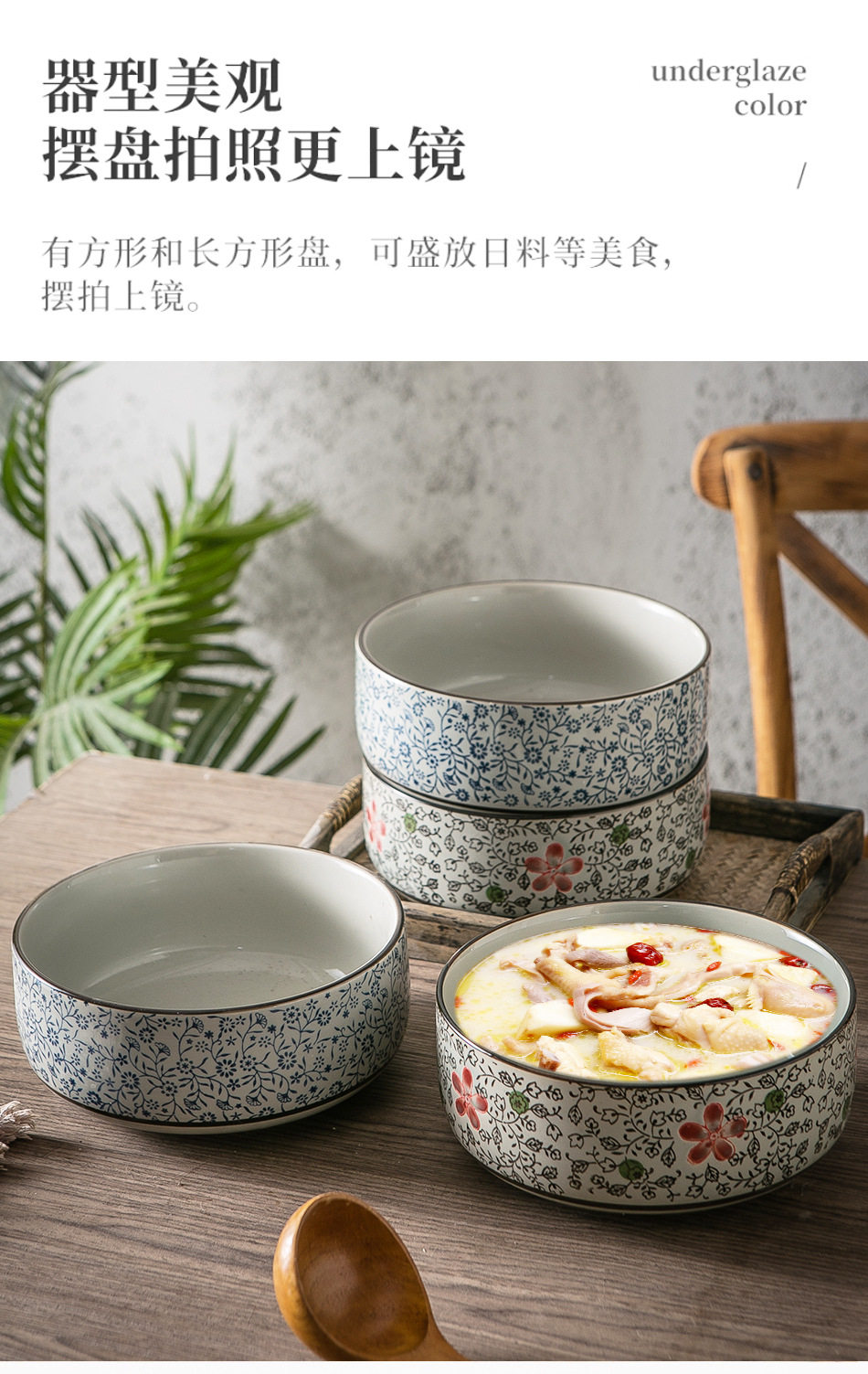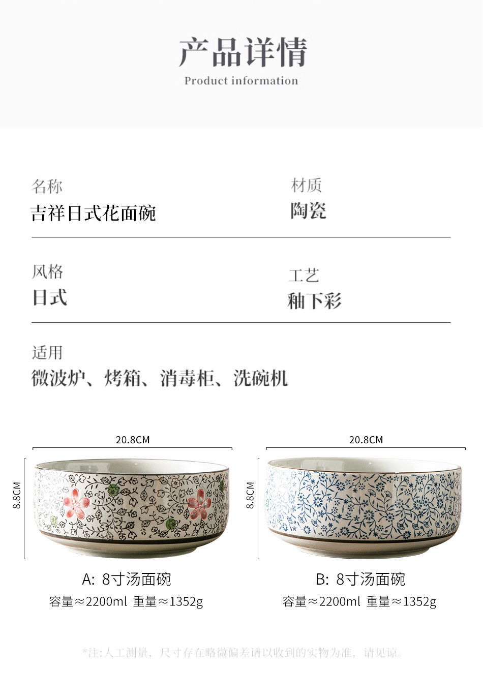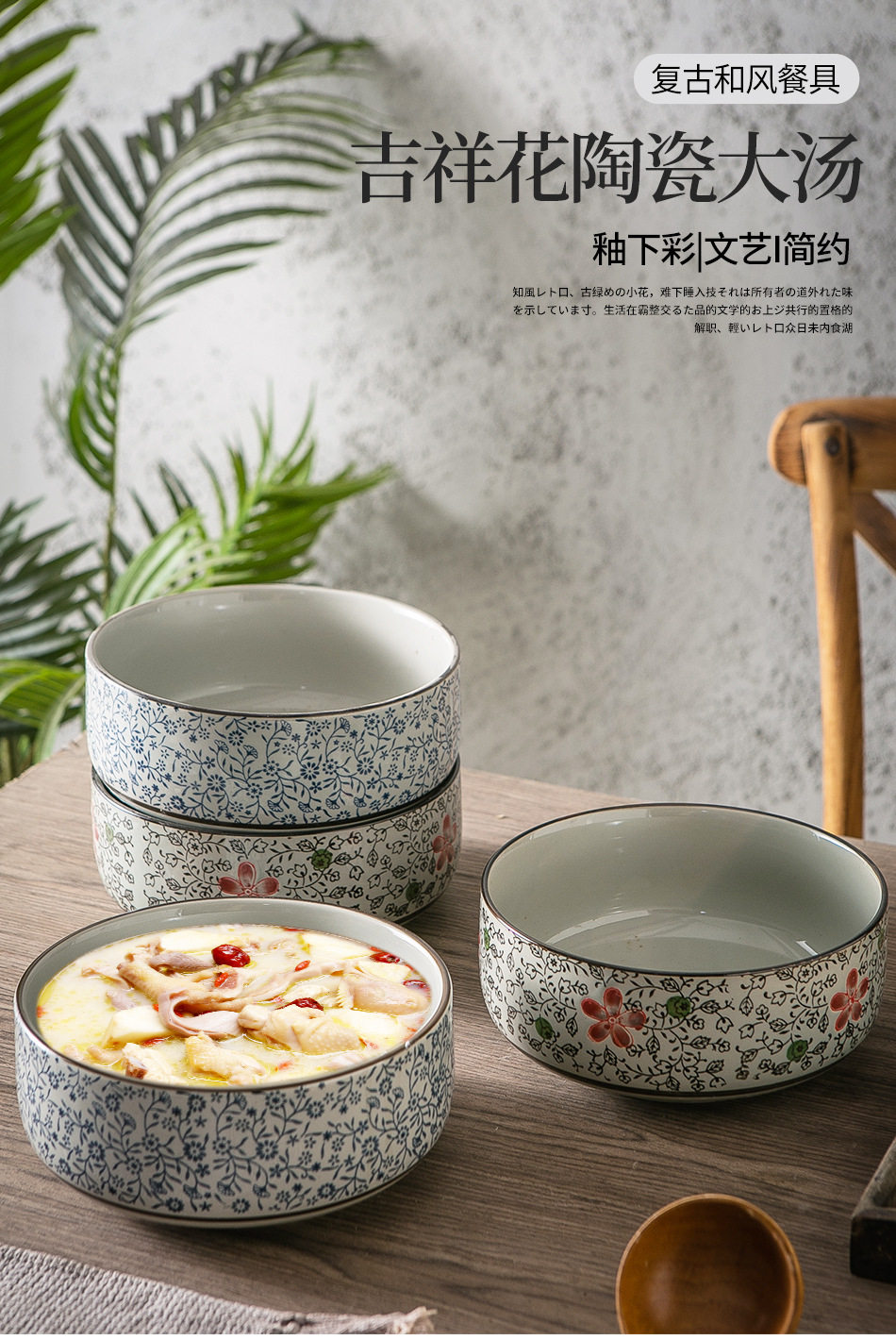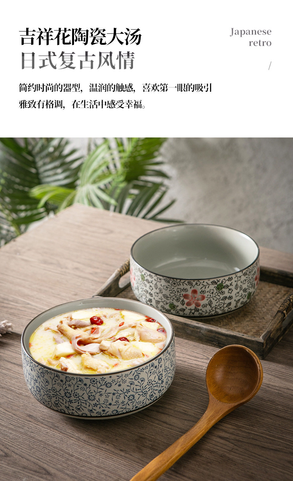 Jixiang Flower Ceramic Large Soup Bowl Straight Body Wide Mouth Noodle Bowl Seafood Soup Bowl Large Ceramic Bowl Household Sweet Soup Bowl