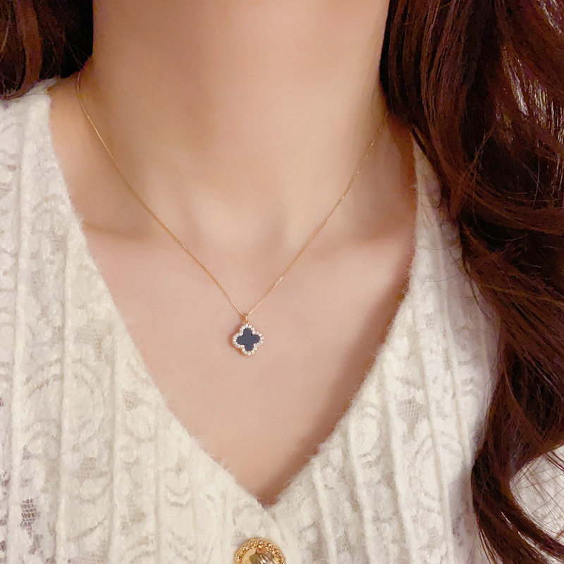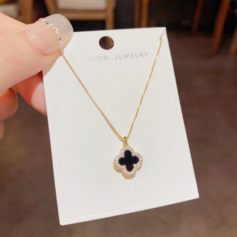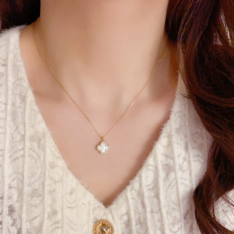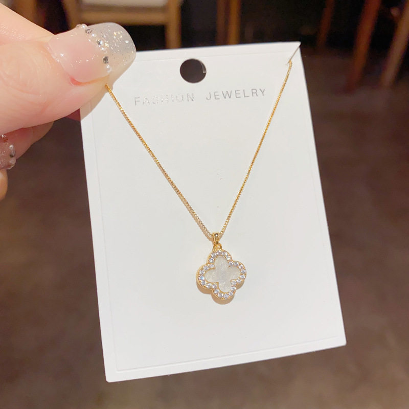 Korean Style Elegant Fashionable Simple Micro-inlaid Zircon Double-sided Four-leaf Flower Necklace Internet Celebrity Distinctive Exquisite Luxury Clavicle Chain