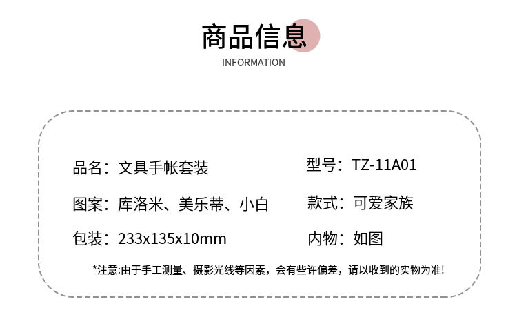 | Specifications | Stationery hand account suit [kulomi]],Stationery hand account suit [melody]],Stationery hand account suit [Xiaobai]],Stationery hand account suit [random delivery]] |