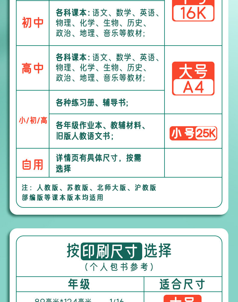 | Specifications | [please consult customer service for large quantities],Self-adhesive book cover - small size 25k (10 sheets of thickened material) comes with name stickers,Self-adhesive book cover-medium size 16k (10 sheets of thickened material) comes with name stickers,Self-adhesive book cover-large size a4k (10 sheets of thickened material) comes with name stickers,Self-adhesive book cover-set (30 pieces of thickened material) comes with name stickers,(20 large sizes, 10 medium sizes) self-adhesive book cover - set/comes with name stickers included,Transparent book cover-25k [10 thickened materials] comes with name stickers,Transparent book cover-16k [10 thickened materials] comes with name stickers,Transparent book cover-a4 [10 thickened materials] comes with name stickers,Transparent book cover-set [30 sheets of thickened material] comes with name stickers,(10 large sizes, 20 medium sizes) transparent book cover - set/comes with name stickers included |