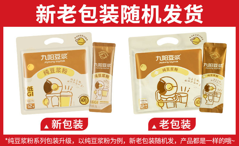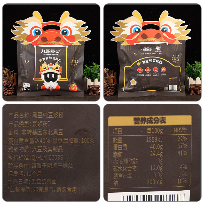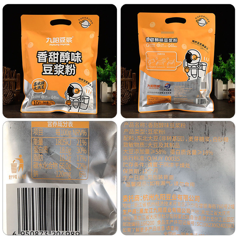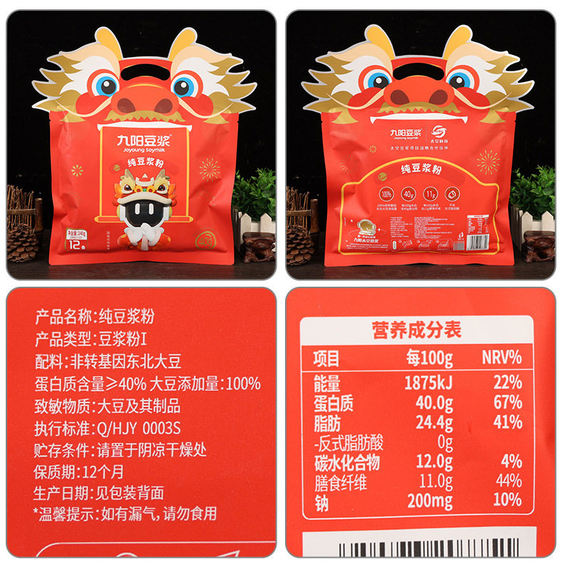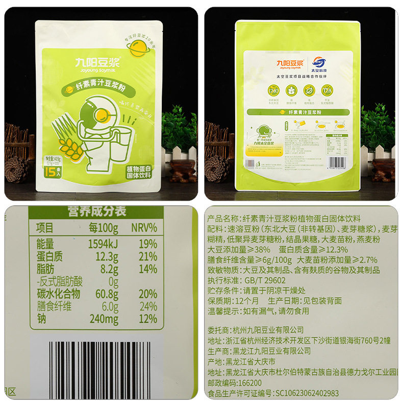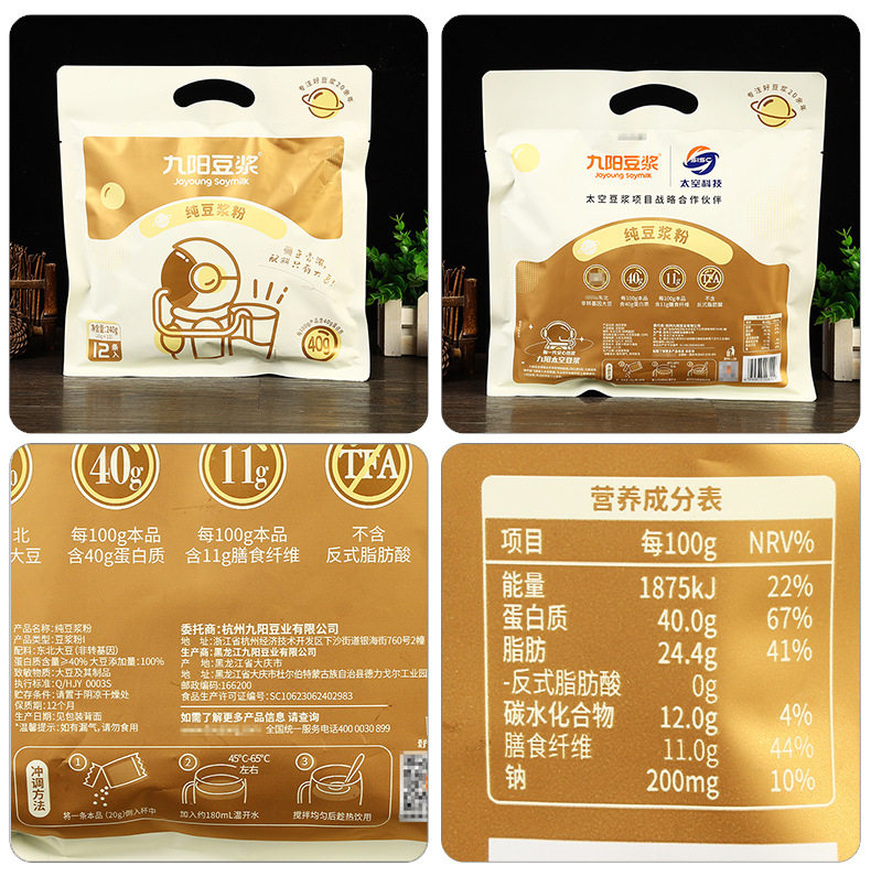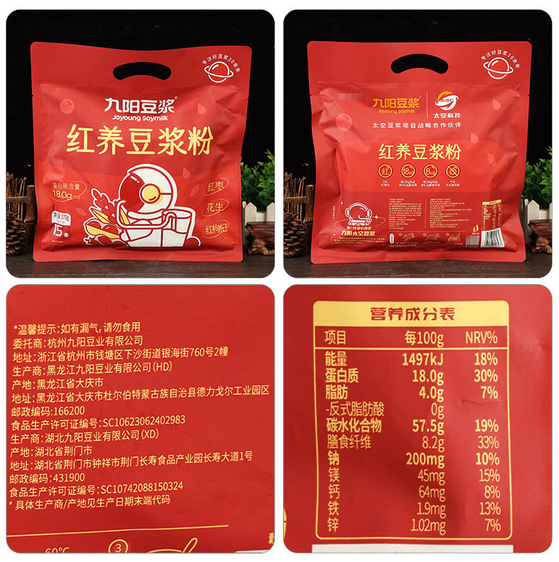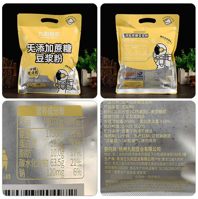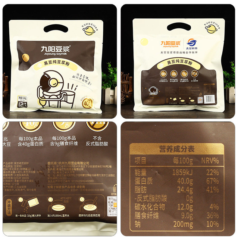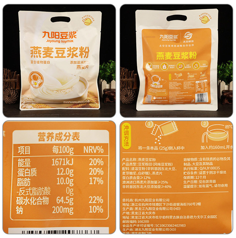 | Packing specification | 240g Jiuyang Soymilk Pure Soymilk Powder * 1 Bag,240g Jiuyang Soybean Milk Black Bean Pure Soybean Milk Powder [Black Bean] * 1 Bag,375g Jiuyang Red Soymilk Powder * 1 Bag,270g Jiuyang Soymilk Soymilk Powder [No Sucrose Added] * 1 Bag,250g Jiuyang oat soybean milk powder * 1 bag,200g Jiuyang Organic Black Bean Pure Soymilk Powder * 1 Bag,200g Jiuyang Organic Pure Soymilk Powder * 1 Bag,375g Jiuyang black soybean milk powder * 1 bag,270g Jiuyang Soymilk Soymilk Powder [Sweet and Mellow] * 1 Bag,240g Jiuyang Soymilk Pure Soymilk Powder * 3 Bags,240g Jiuyang Soybean Milk Black Bean Pure Soybean Milk Powder [Black Bean] * 3 Bags,375g Jiuyang Red Soymilk Powder * 3 Bags,270g Jiuyang Soymilk Soymilk Powder [No Sucrose Added] * 3 Bags,250g Jiuyang Oat Soymilk Powder * 3 Bags,200g Jiuyang Organic Black Bean Pure Soymilk Powder * 3 Bags,200g Jiuyang Organic Pure Soymilk Powder * 3 Bags,375g Jiuyang Black Soymilk Powder * 3 Bags,270g Jiuyang Soymilk Powder [Sweet and Mellow] * 3 Bags |