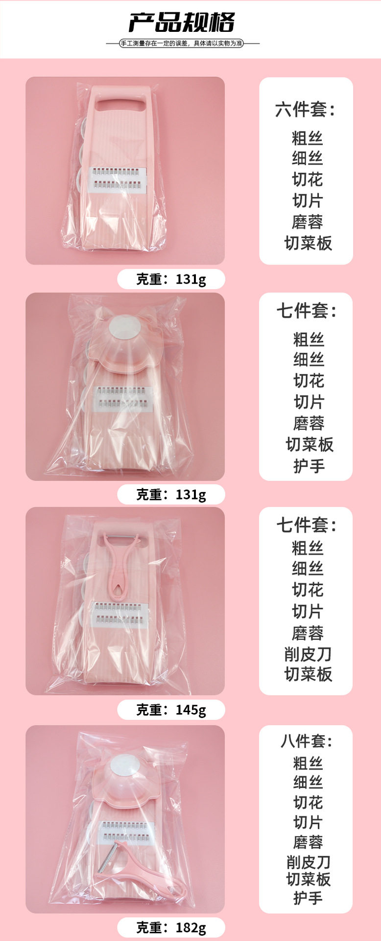 | Color | Blue 5-piece set: cutting board + 4 knives (opp transparent bag),Blue 6-piece set: cutting board + 5 knives (opp transparent bag),Blue 7-piece set: 5 knives for vegetable cutter + hand guard (opp transparent bag),Blue 7-piece set: 5 knives for vegetable cutter + paring knife (opp transparent bag),Blue 8-piece set: vegetable cutter + hand guard + paring knife (opp transparent bag),Pink 5-piece set: cutting board + 4 knives (opp transparent bag),Pink 6-piece set: cutting board + 5 knives (opp transparent bag),Pink 7-piece set: 5 knives for vegetable cutter + hand guard (opp transparent bag),Pink 7-piece set: 5 knives for vegetable cutter + paring knife (opp transparent bag),Pink 8-piece set: vegetable cutter + hand guard + paring knife (opp transparent bag) |