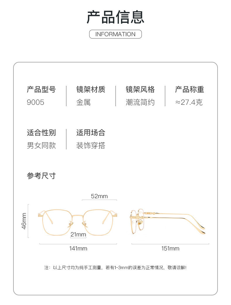 | Frame Color | Bright gold,Bright Silver,Bright gold discoloration gray,Bright silver discoloration gray |