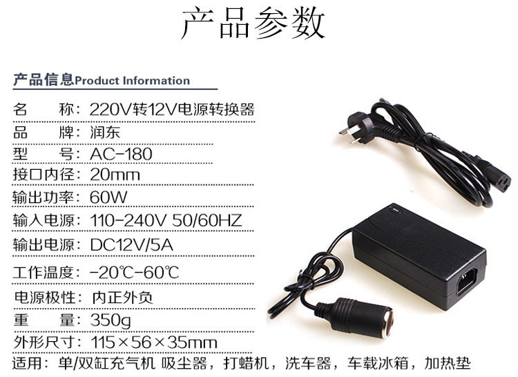 220V to 12V Power Converter Car Vacuum Cleaner Refrigerator Air Pump to Household Power Supply 12V5 Cigarette Lighter