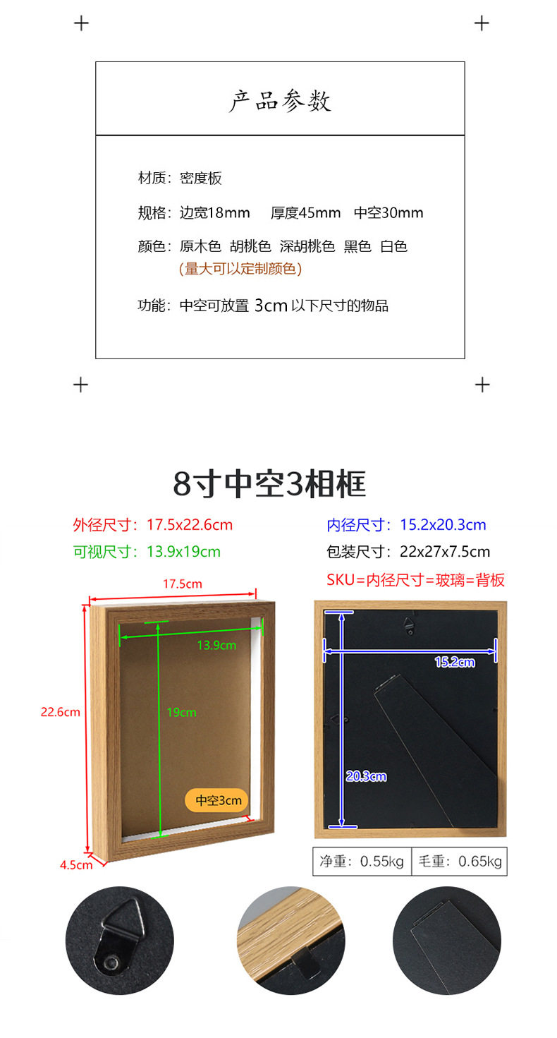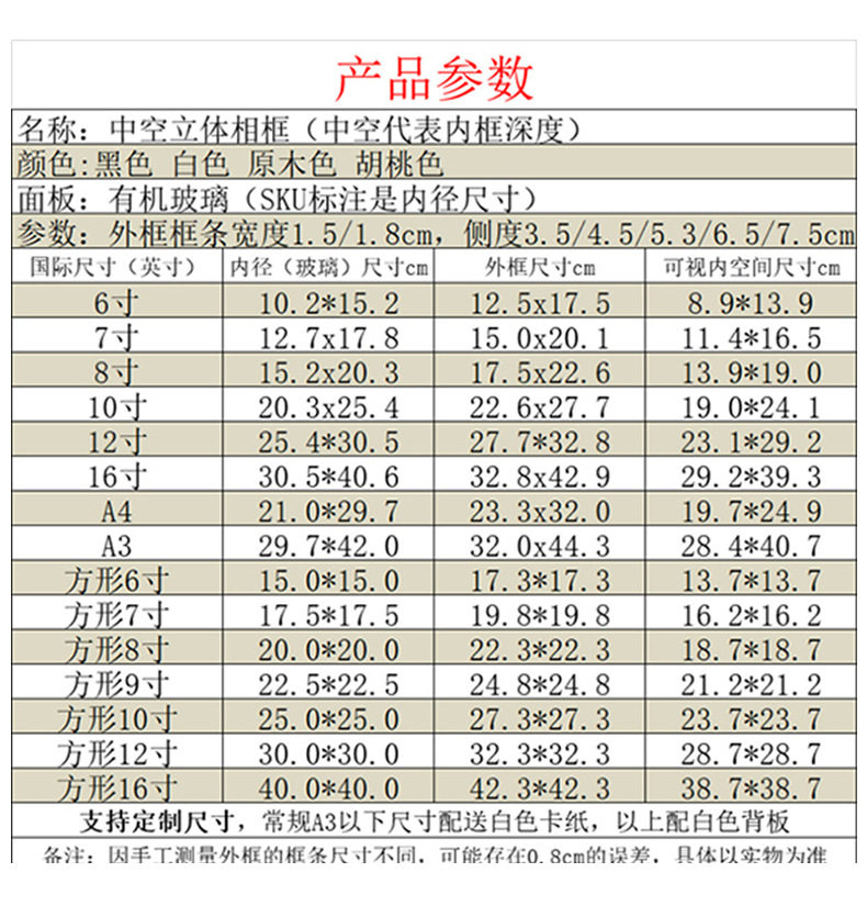 | Inner frame size | Log color single photo frame [hollow 3cm],Walnut color single photo frame [hollow 3cm],White single photo frame [hollow 3cm],Black single photo frame [hollow 3cm] |