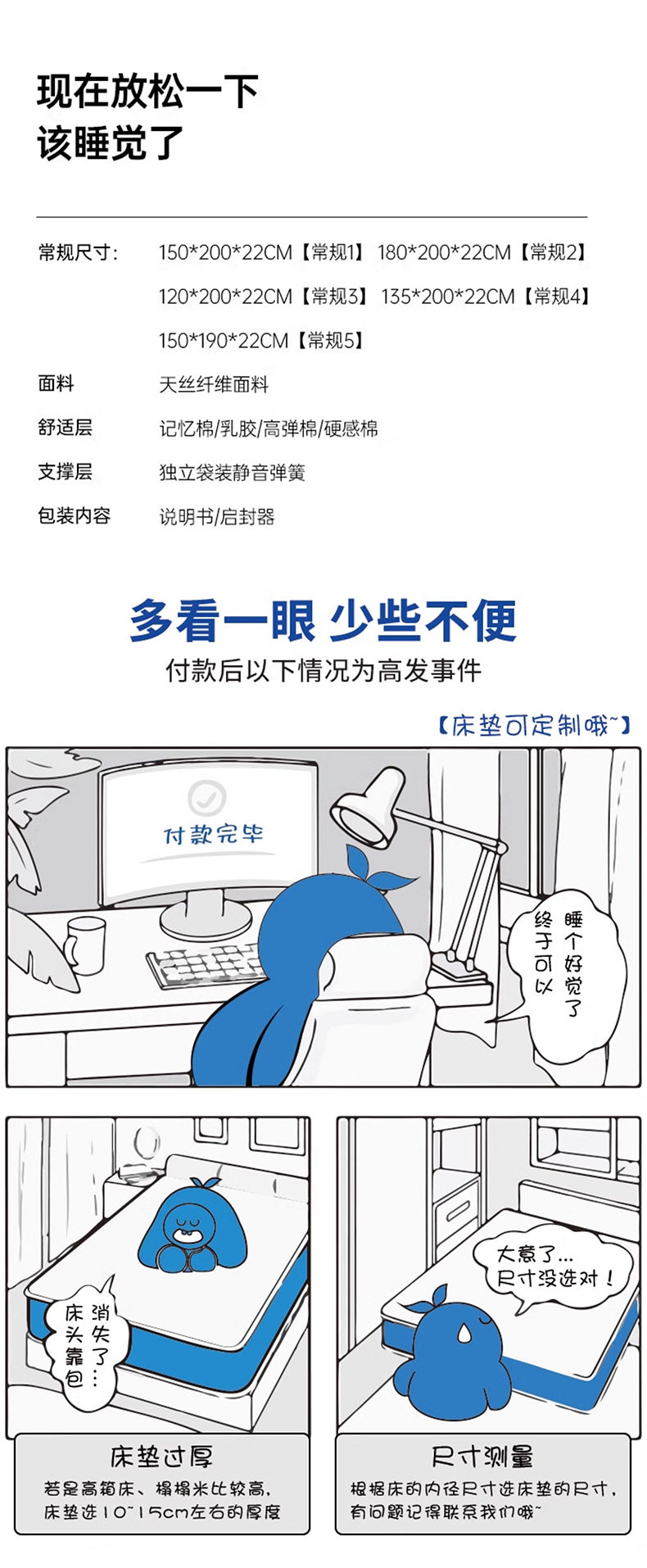 | Color | A moderate: distinguished Tencel bag spring thickness ≈ 21cm,B soft: distinguished Tencel high elastic cotton bag spring thickness ≈ 22cm,C mute and comfortable: distinguished Tencel 2cm environmental protection latex bag spring thickness ≈ 22cm,D zero pressure comfort: distinguished Tencel memory cotton bag spring thickness ≈ 22cm |