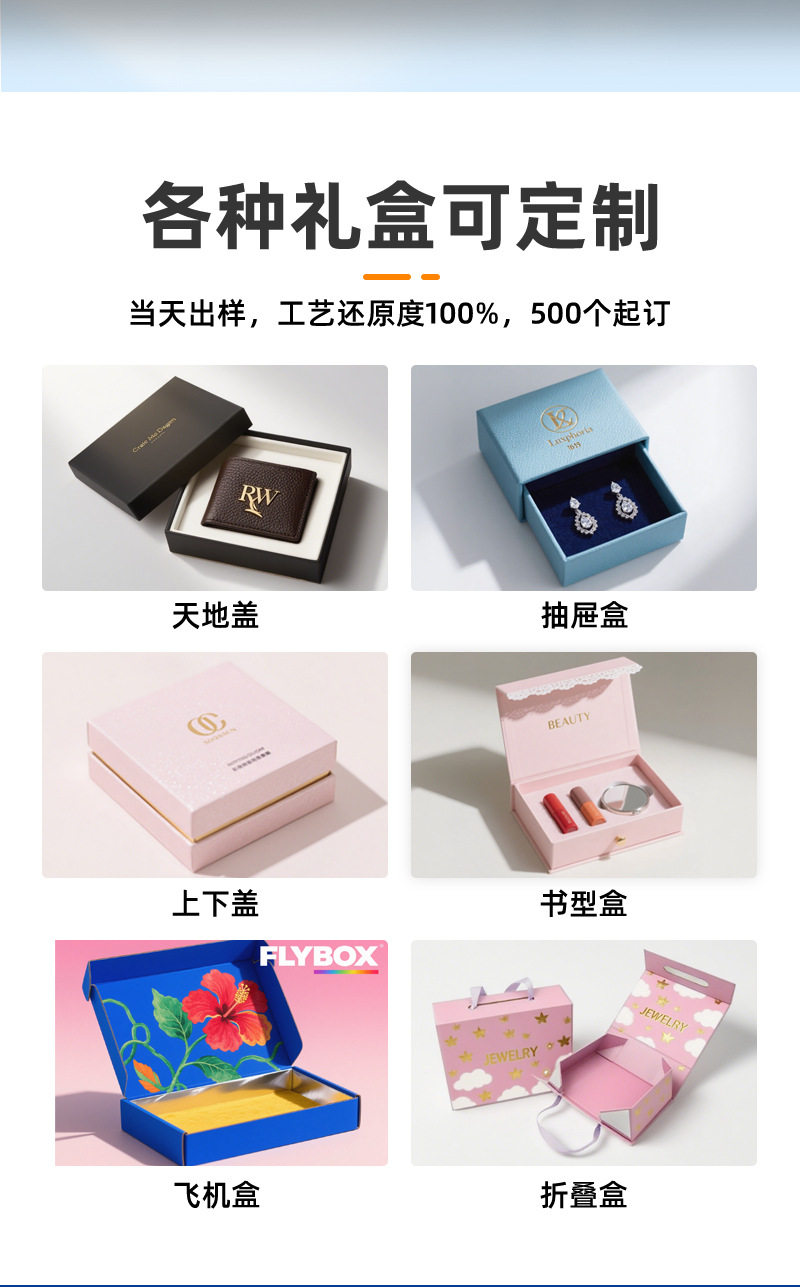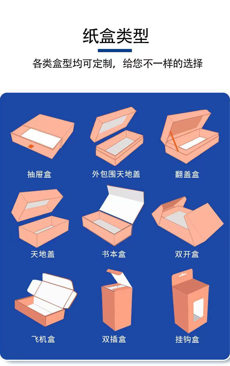 Specification model Flip box; customized,Heaven and earth cover; customized,Upper and lower covers; customized,Drawer box; customized,Book-shaped box; customized,Folding box; customized,Other box types; customized