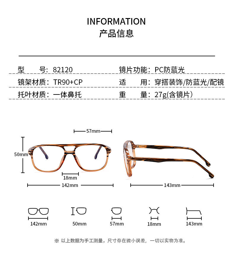 | Frame Color | C1 bright black/anti-blue light,C2 bright black/white transparent/anti-blue light,C3 White Radiance/Anti-Blue Light,C4 gray transparent/anti-blue light,C5 blue stripe/anti-blue light,C6 tea stripes/anti-blue light |