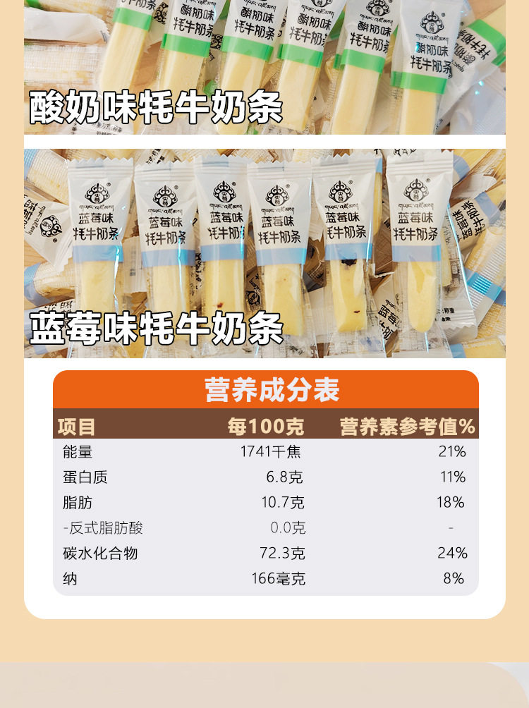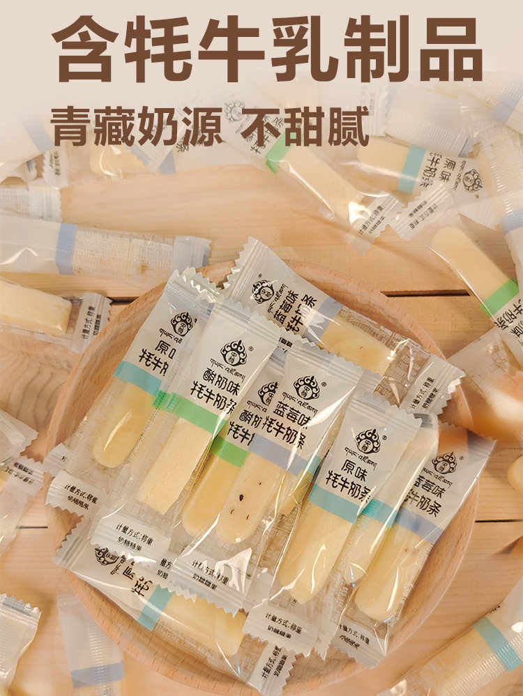 | Packaging specifications | Bulk yak milk bars 250g/bag [original flavor],Bulk yak milk bar 250g/bag [blueberry flavor],Bulk yak milk bars 250g/bag [yoghurt flavor],Bulk yak milk bars 250g/bag [mixed flavors] |