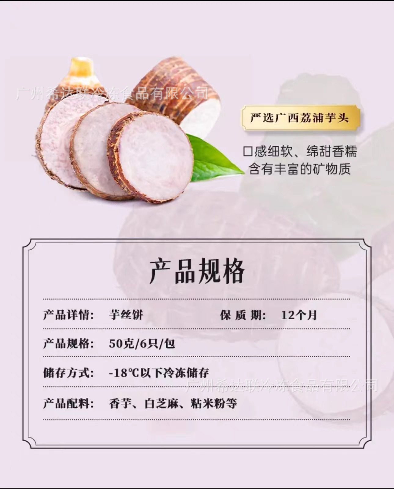 | Raw materials and ingredients | Taro, potato starch, edible lard |