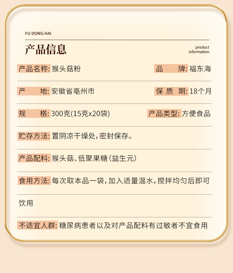 | Packing specification | Hericium mushroom powder 300g (15g x20 bags)/box |