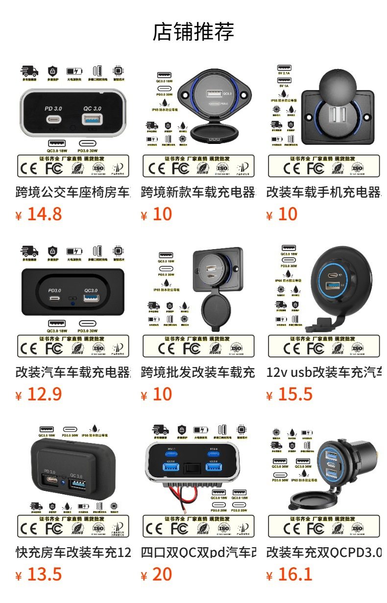 | Model | Dual-port fast charging usb+type-c qc3.0+pd3.0,Three charging ports for fast charging, dual usb+type-c, dual qc3.0+pd3.0,Dual-port fast charging dual usb dual qc3.0,Three charging ports dual usb+type-c 3*2.1a,Back curved armrest installation usb+type-c qc3.0+pd3.0,Back curved armrest installation dual usb+type-c 3*2.1a,Back curved armrest installation model dual usb+type-c dual qc3.0+pd3.0,Curved back armrest installation model, dual port fast charging, dual usb dual qc3.0 |