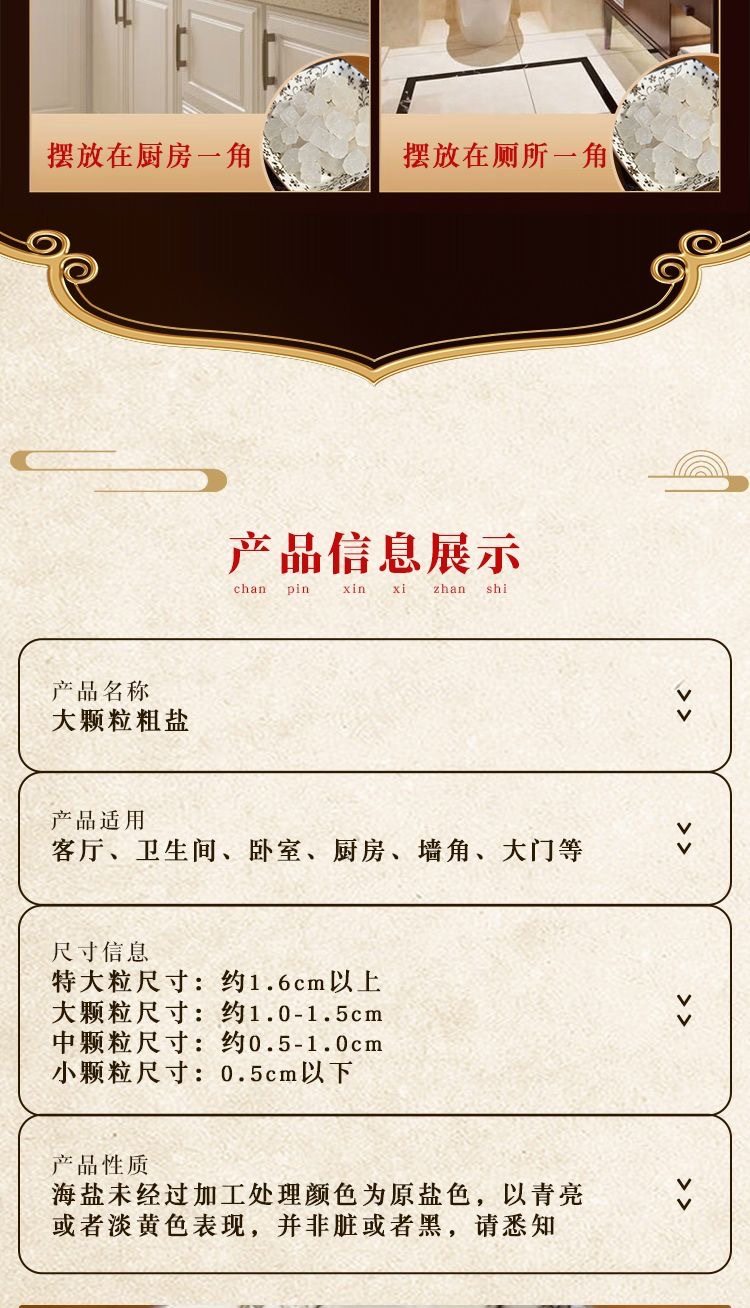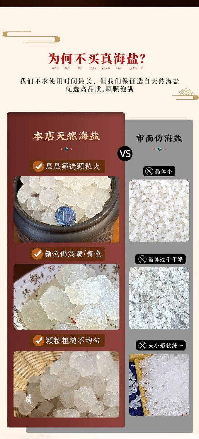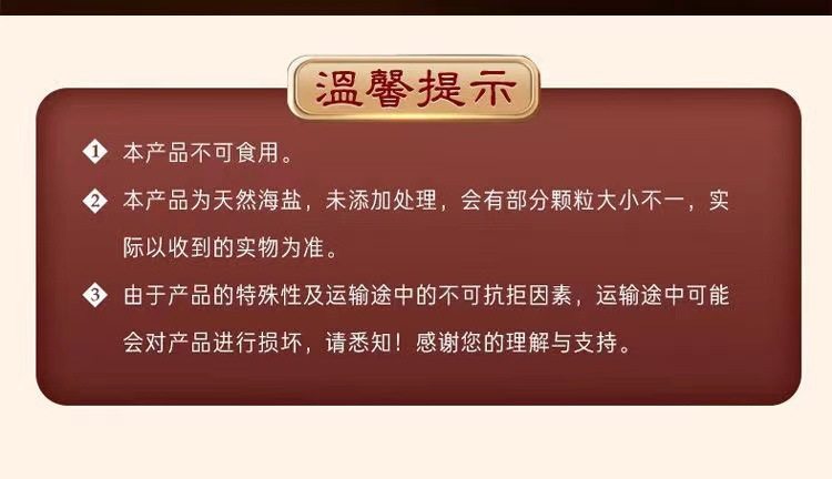 | Packaging specifications | 2.5kg extra large sea salt + 1 hot compress bag,2.5kg large granules of sea salt + 1 hot compress bag,2.5kg small grains of sea salt + 1 hot compress bag,1.5kg extra large sea salt + 1 hot compress bag,1.5kg large granules of sea salt + 1 hot compress bag,1.5kg small grains of sea salt + 1 hot compress bag,2.5kg extra large sea salt [salt only],2.5kg large grains of sea salt [salt only],2.5kg small grains of sea salt [salt only],1.5kg extra large sea salt granules [salt only],1.5kg large sea salt granules [salt only],1.5kg small grains of sea salt [salt only],0.5kg crushed sea salt [salt only] |