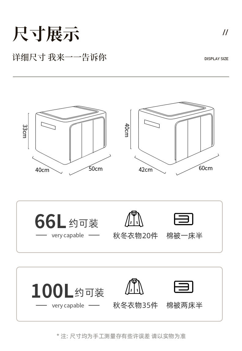 | Size | 24L 40*30*20 CM,66L 50*40*33CM,100L 60*42*40 CM |