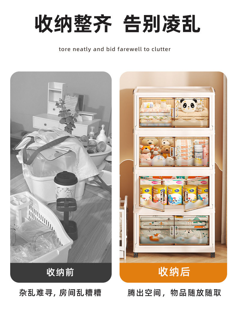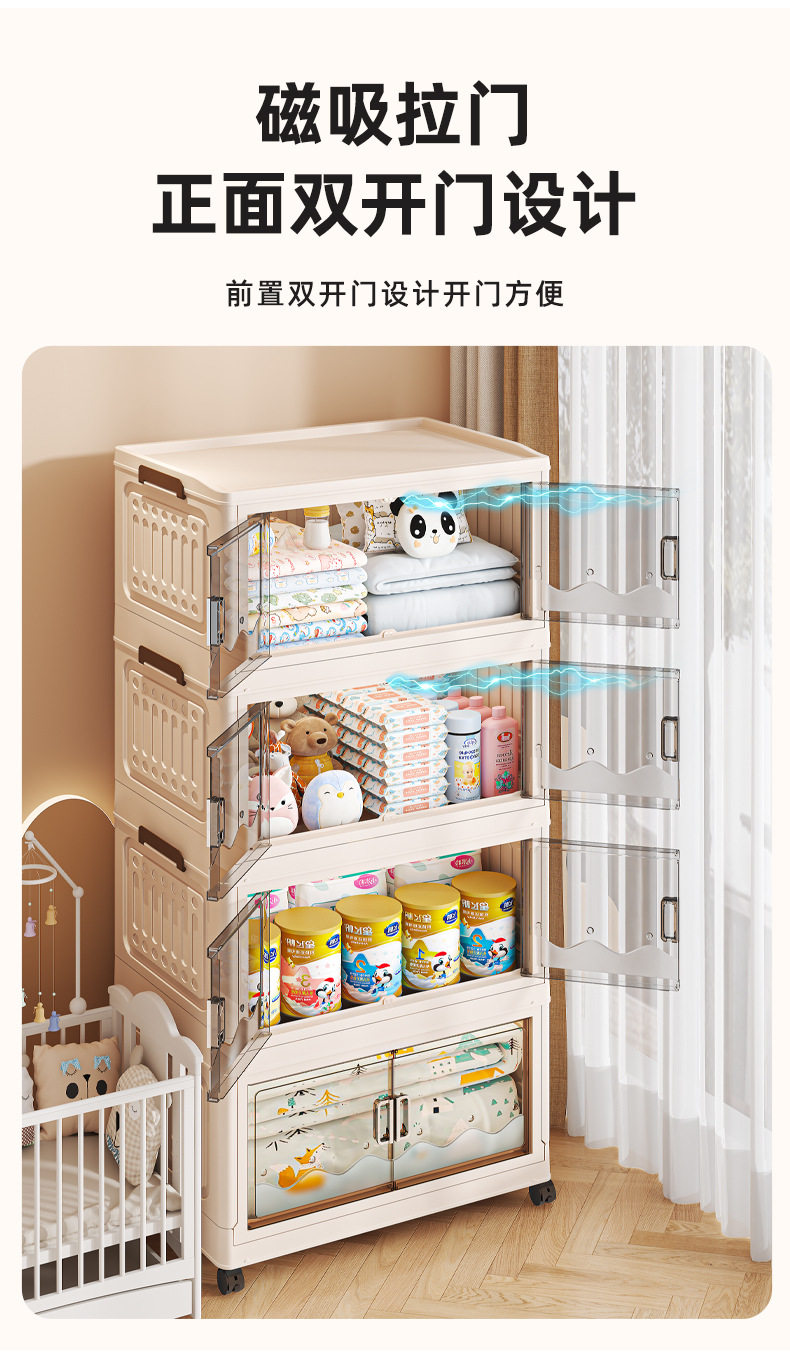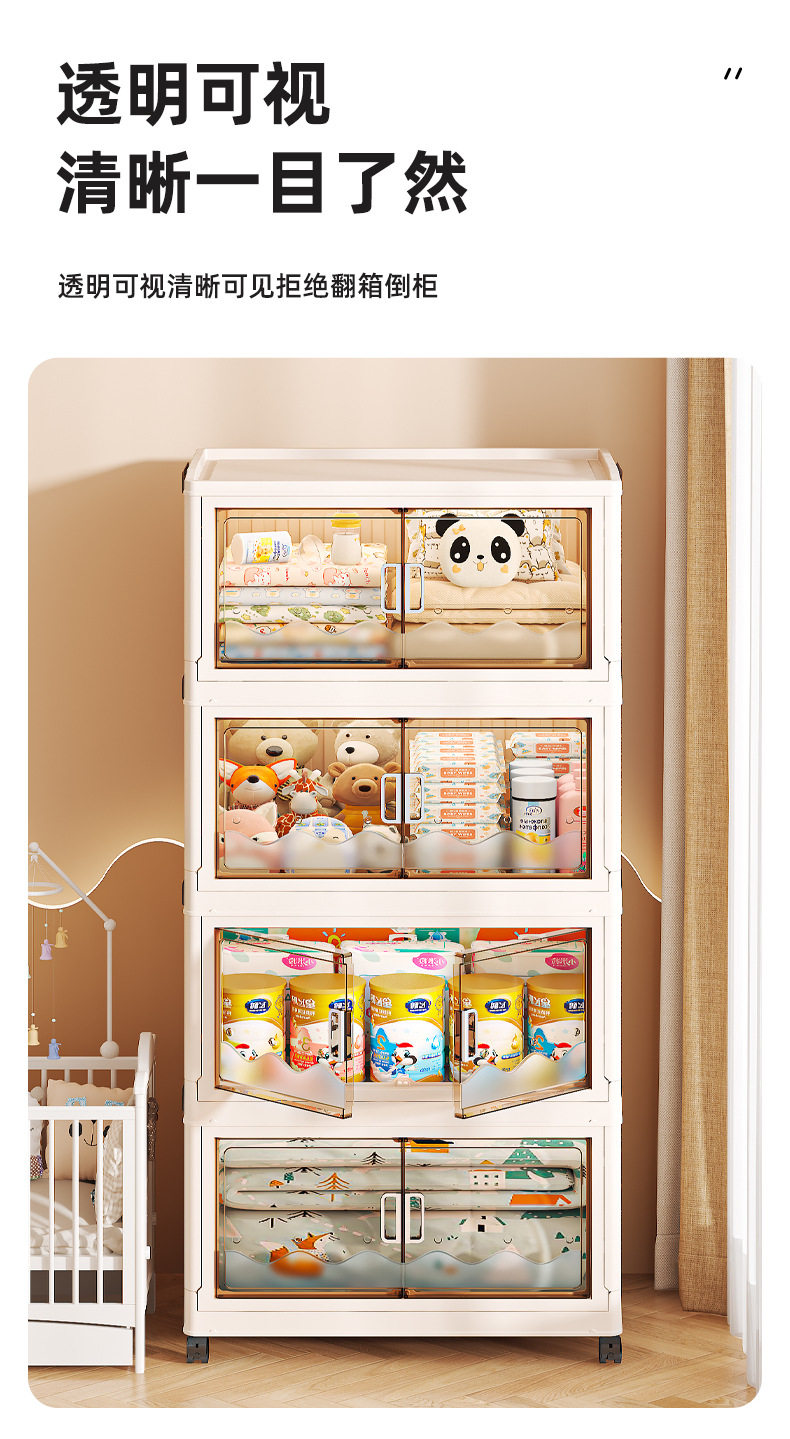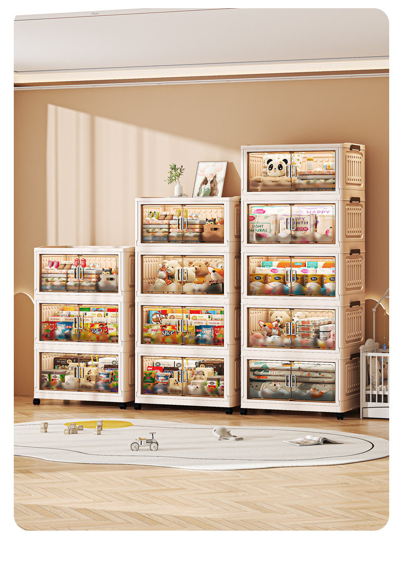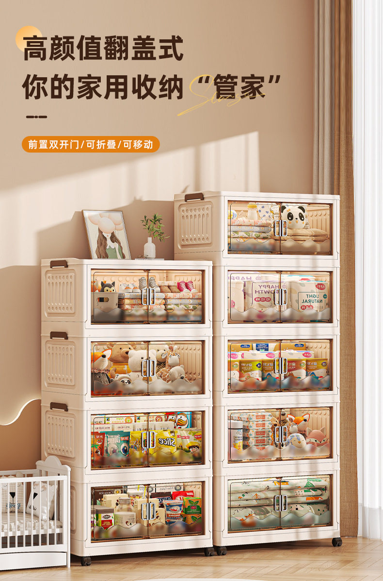 Cross-border Storage Cabinet Folding Storage Box Household Double Door Magnetic Suction Transparent Tidying Box Book Storage Box Pulley Car
