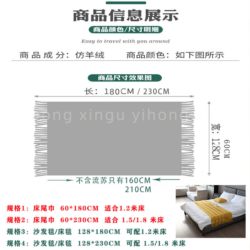 | Dimensions | 60*180cm bed end towel,60*230cm bed end towel,127*180cm (sofa blanket + bed),127*230cm (sofa blanket + bed) |