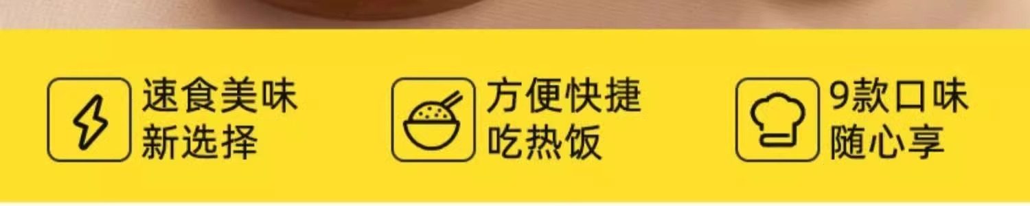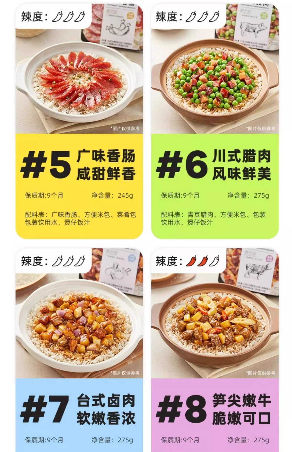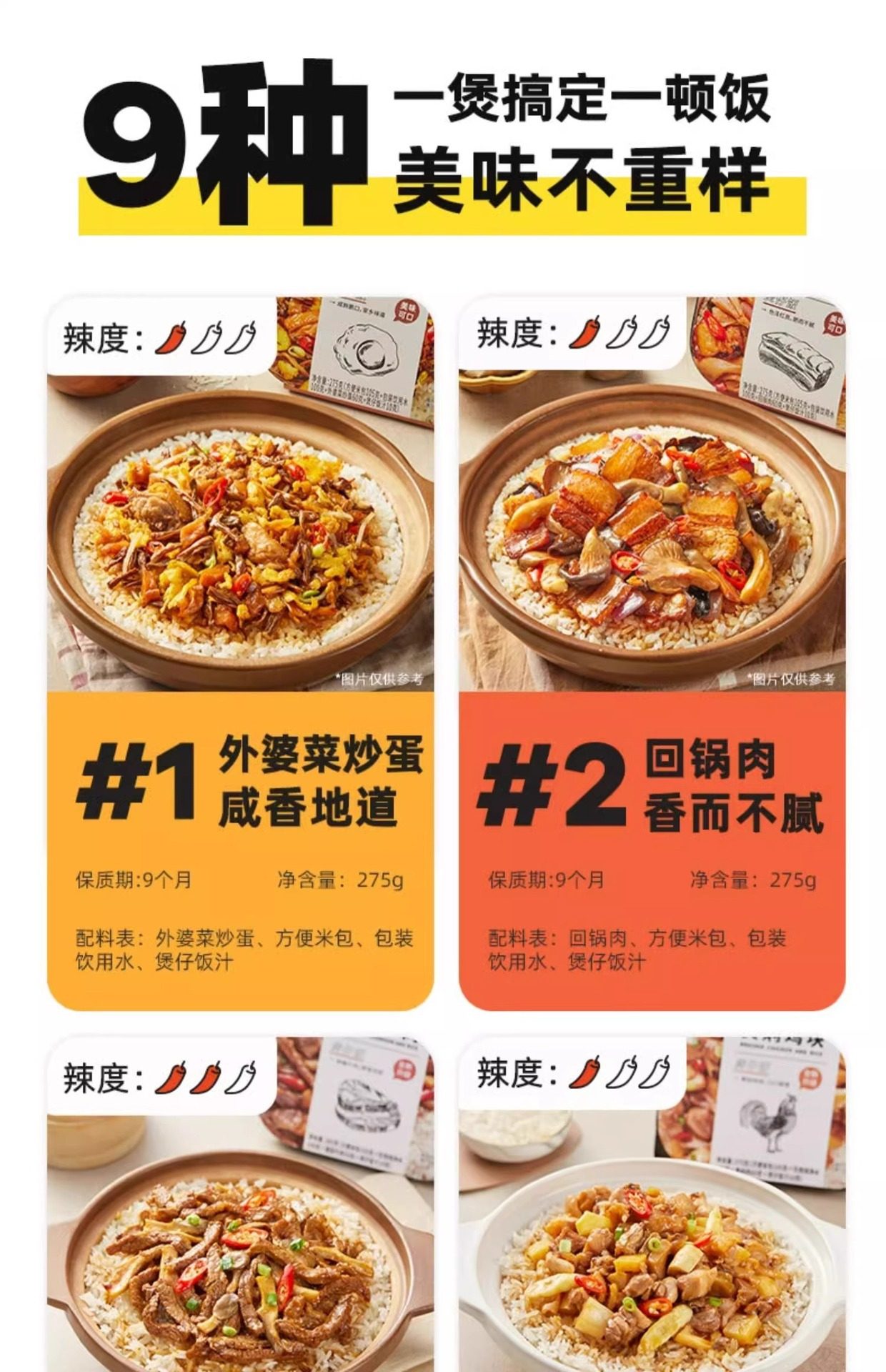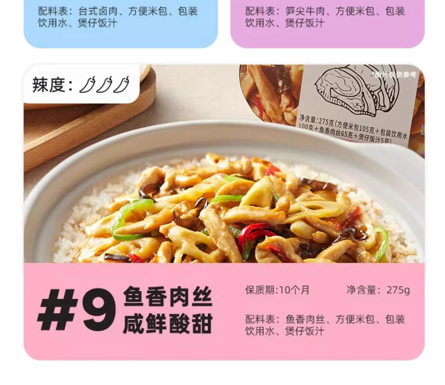 | Packaging specifications | Sichuan-flavored bacon self-heating rice 275g,Stewed chicken self-heating rice 275g,Self-heating rice with bamboo shoot tip beef 275g,Self-heating rice with braised pork and pickled vegetables 305g,Curry beef self-heating rice 285g,Taiwanese braised pork claypot rice 275g,Mushroom and beef claypot rice 265g,Fish-flavored shredded pork claypot rice 275g,Cantonese sausage claypot rice 245g,Stewed chicken and claypot rice 275g,Tender beef claypot rice with bamboo shoots 275g,Malatang self-heating hot pot 260g,Maosuowang self-heating hot pot 340g,Old chengdu 300g self-heating hot pot,Spicy tender beef self-heating hot pot 410g,Tomato beef brisket self-heating hot pot 420g,Spicy chicken self-heating rice 175g [haidilao],Teriyaki chicken self-heating rice 181g [haidilao],Fish-flavored shredded pork self-heating rice 187g [haidilao],Stewed chicken self-heating rice 187g [haidilao],Braised beef self-heating rice 272 [haidilao],Curry beef self-heating rice 272g [haidilao],Cantonese claypot self-heating rice 187g [haidilao],Tomato beef brisket self-heating rice 187g [haidilao] |