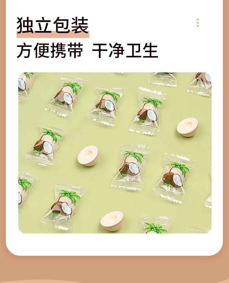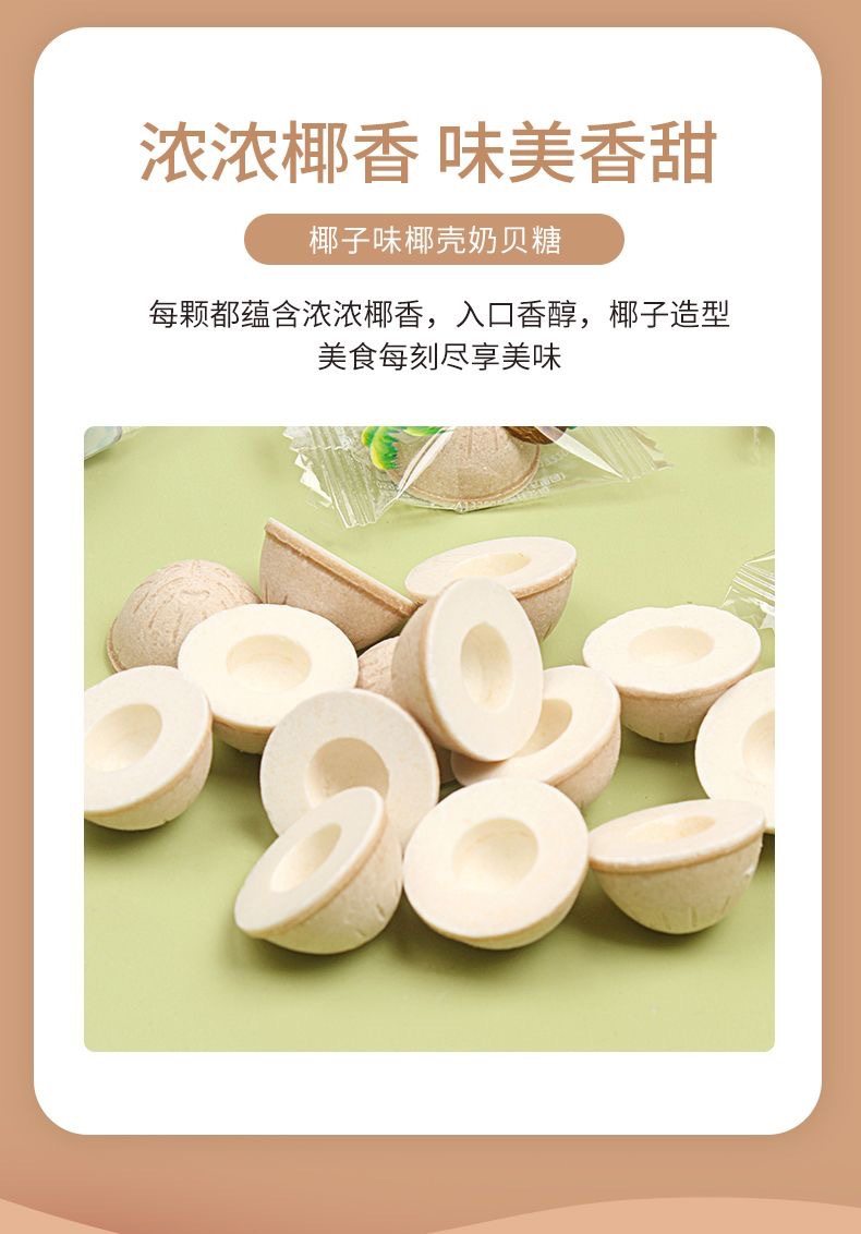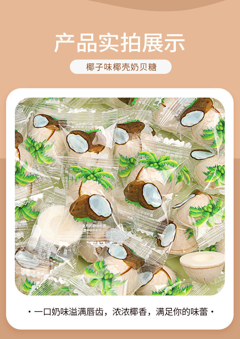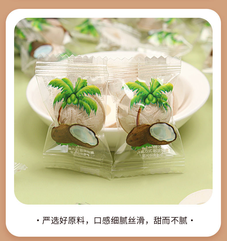 Packaging specifications Coconut shell milk candy 2.5kg pack,Coconut shell milk candy 15kg / box,Coconut shell milk candy 500g,Coconut milk candy 250g,Coconut milk candy 100g