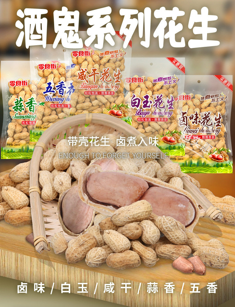 | Packing specification | Garlic Peanut (208g)* Bag,Salted and dried peanuts (208g)* bag,SPELPEANUT (208g)* BAG,White jade peanut (208g)* bag,Marinated Peanut (208g)* Bag |