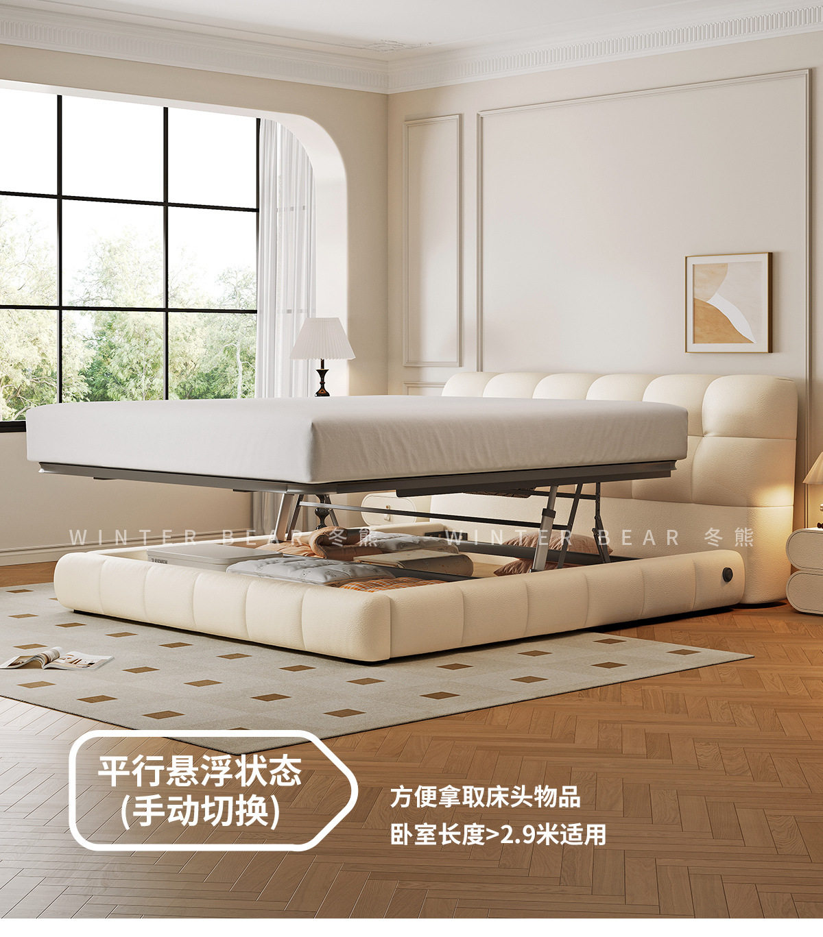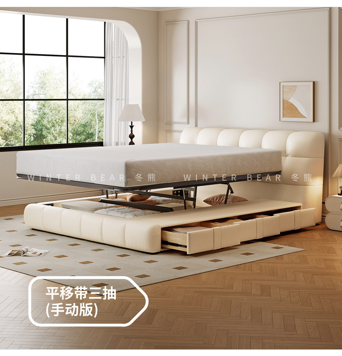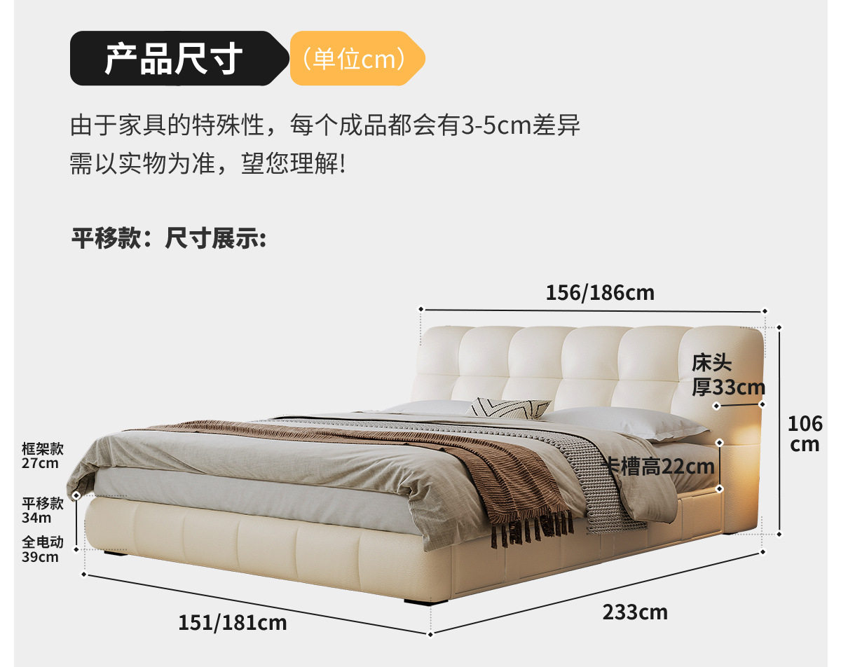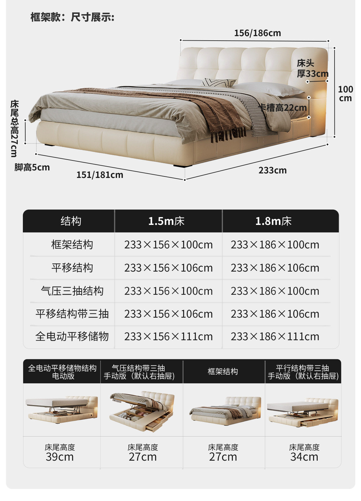 | Size | 1500*2000mm frame structure,1800*2000mm frame structure,1500*2000mm translation storage high box,1800*2000mm translation storage structure,1500*2000mm high tail box storage with three drawers,1800*2000mm high tail box storage with three drawers,1500*2000mm translation storage + three drawers,1800*2000mm translation storage + three drawers,1500*2000mm fully electric translation storage structure,1800*2000mm fully electric translation storage structure |