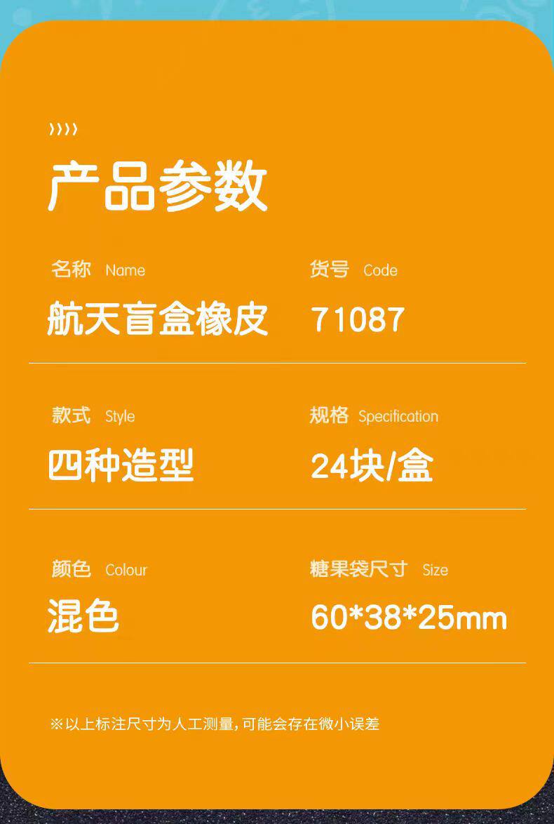 | Specifications | Deli 71087 Space Blind Box Rubber |