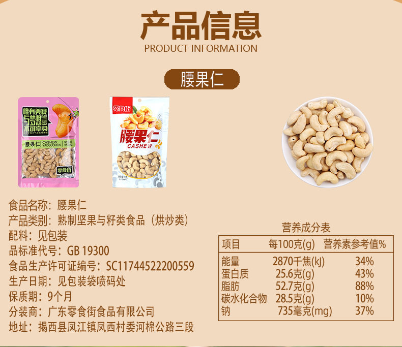 Packing specification Cashew nuts (65g),Cashew nuts (70g)