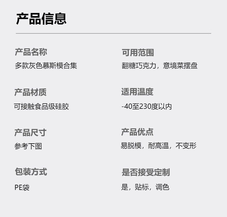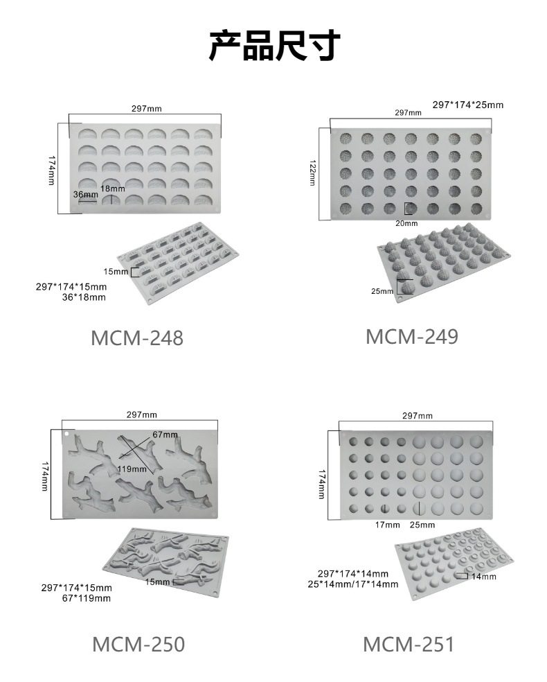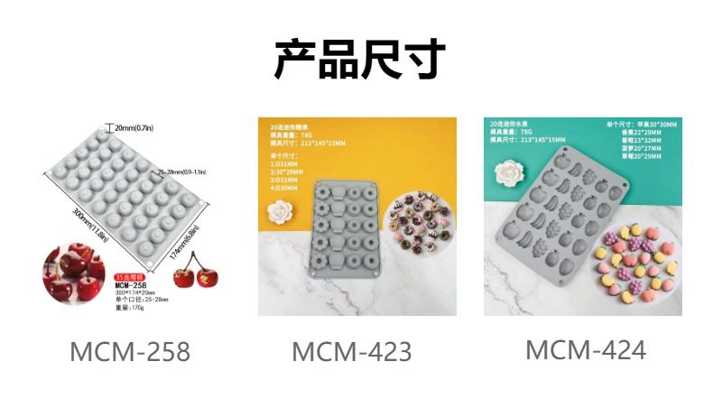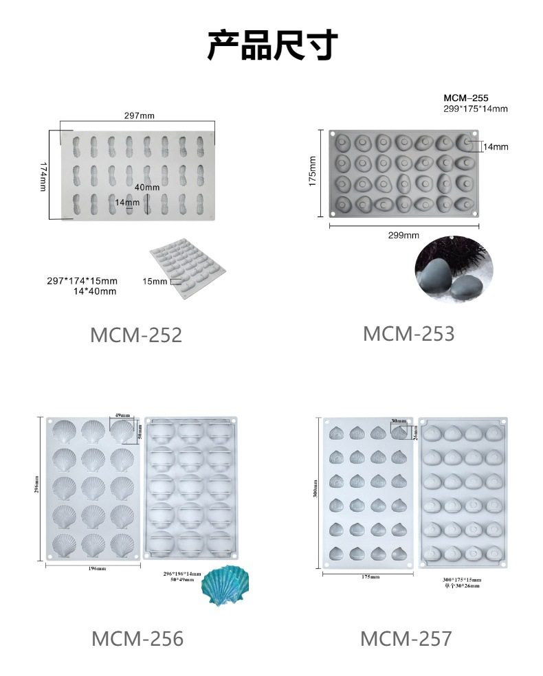 Specification (136g) 30 orange segments mcm-248,(145g) 35 lianshu plum mcm-249,(142g) 6-tree vine mcm-250,(131g) 40 mushrooms mcm-251,(144g) 24 peanuts mcm-252,(132g) 28 pebbles mcm-255,(182g) 15 shells mcm-256,(148g) 24 grains of millet mcm-257,(170g) 35 cherries mcm-258,(77g) 20 mini candies mcm-423,(78g) 20 mini fruits mcm-424,(170g) 15 rings mcm-425,(170g) 20 cheese mcm-426,(101g) 30 almonds mcm-651,(135g) 30 olive molds mcm-702,(150g) 10 oyster molds mcm-703,(103g) 18 walnuts mcm-704