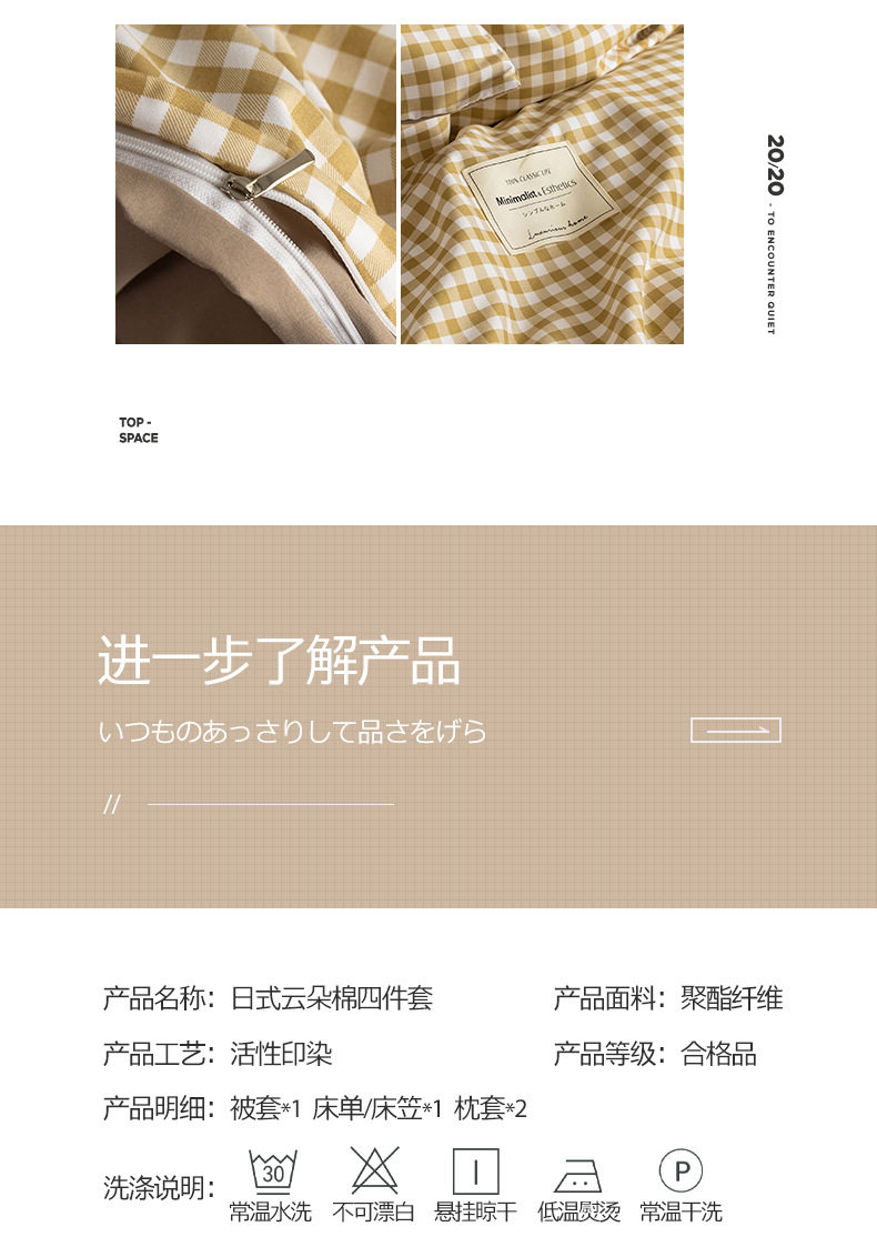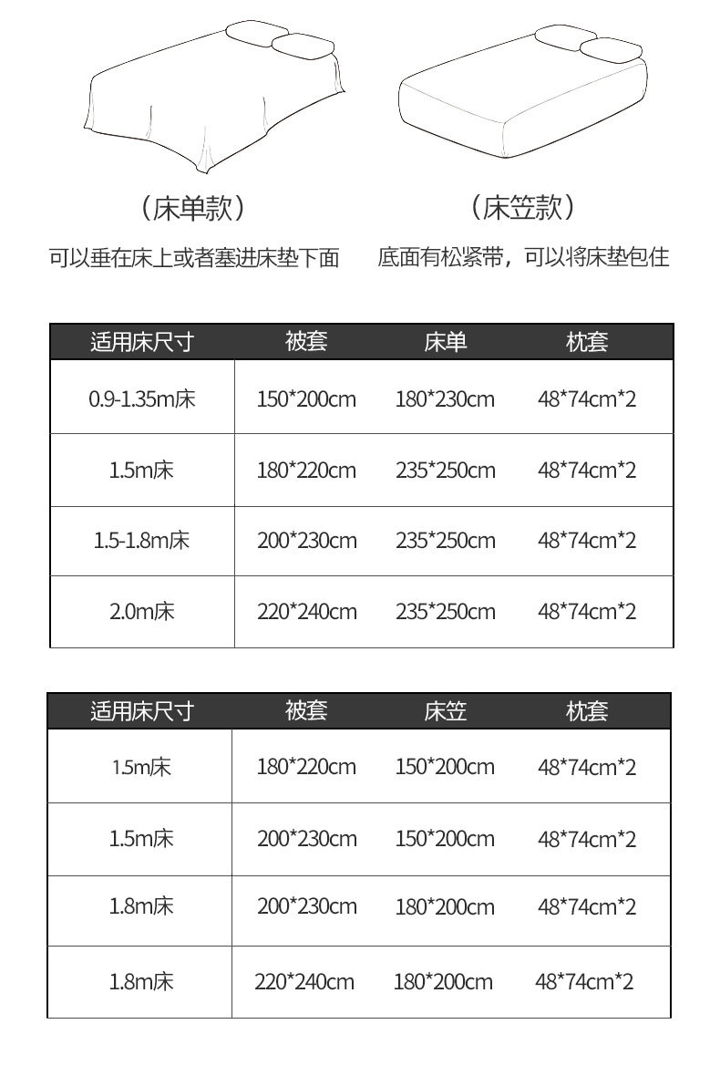 | Dimensions | 1.2m sheets set of three (quilt cover 150x 200cm),1.2m sheets set of four (quilt cover 150x 200cm),1.5m sheet four-piece set (quilt cover 150x 200cm),1.5m sheet four-piece set (quilt cover 180 X220cm),1.5m sheet four-piece set (quilt cover 200 X230cm),1.8m sheet four-piece set (quilt cover 180 X220cm),1.8m sheet four-piece set (quilt cover 200 X230cm),2.0m sheet four-piece set (quilt cover 220 X240cm),1.2m bed hat set of three (quilt cover 150 X200cm),1.2m bed hat four-piece set (quilt cover 150 X200cm),1.5m bed hat four-piece set (quilt cover 150x 200cm),1.5m bed hat four-piece set (quilt cover 180 X220cm),1.5m bed hat four-piece set (quilt cover 200 X230cm),1.8m bed hat four-piece set (quilt cover 180 X220cm),1.8m bed hat four-piece set (quilt cover 200 X230cm),1.8m bed hat four-piece set (quilt cover 220 X240cm) |