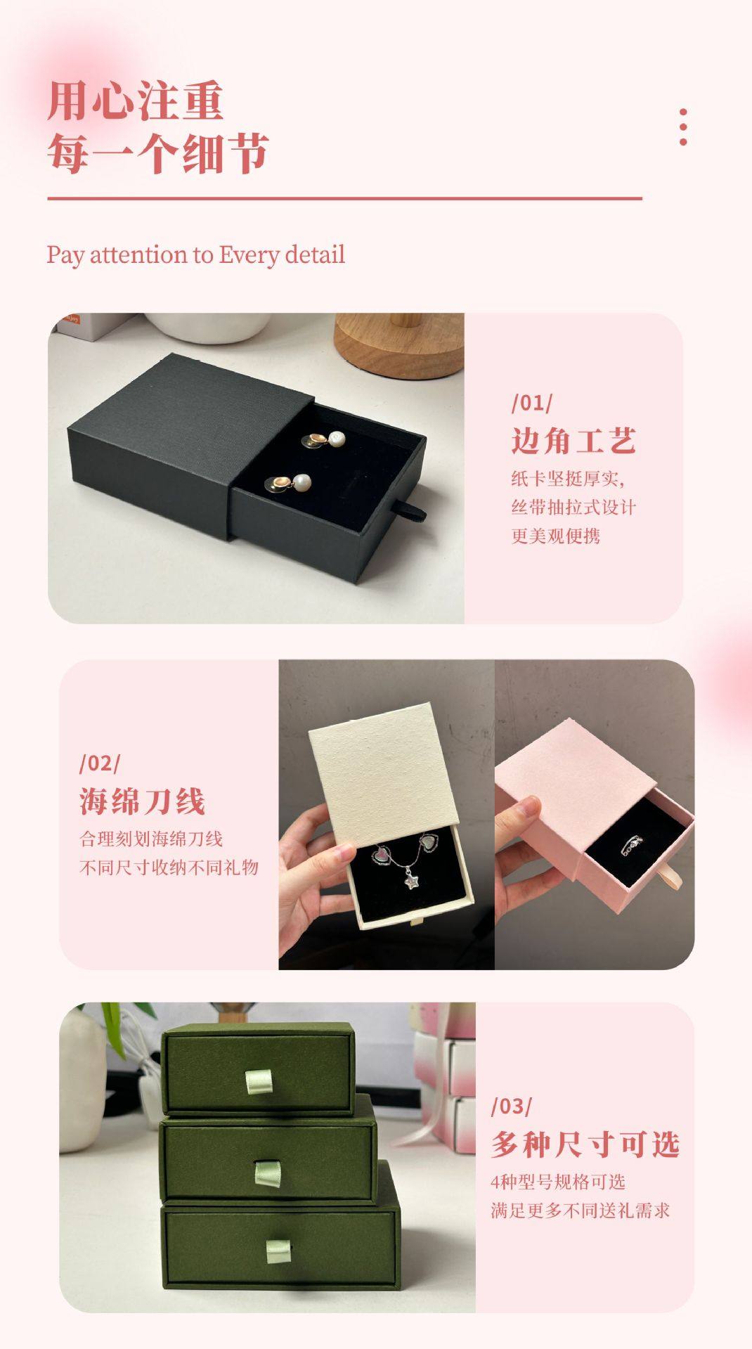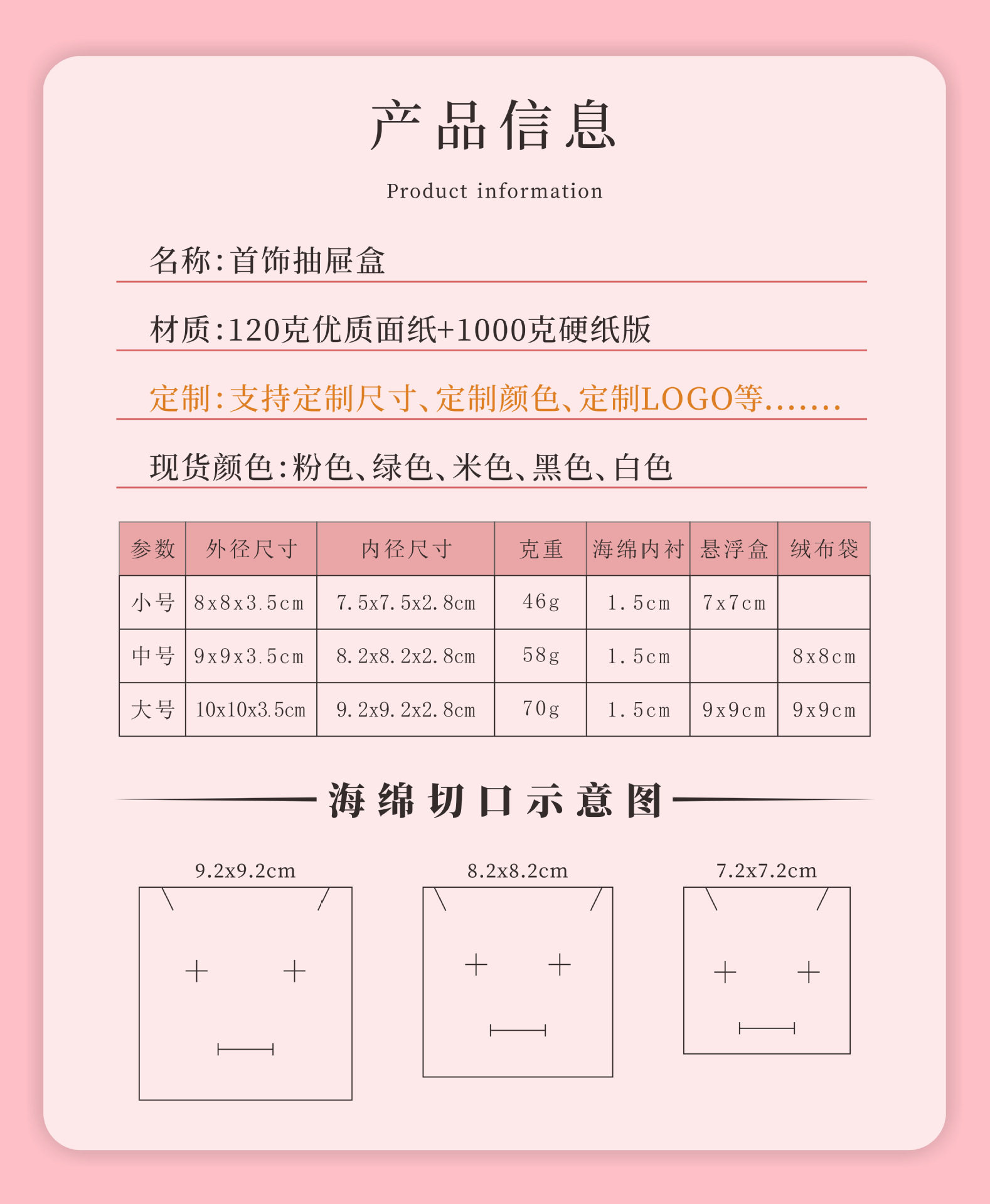 | Specifications and models | Pink drawer box (with sponge); small size inner diameter 7.5x7.5x2.8cm,Pink drawer box (with sponge); medium inner diameter 8.2x8.2x2.8cm,Pink drawer box (with sponge); large inner diameter 9.2x9.2x2.8cm,Green drawer box (with sponge); small size inner diameter 7.5x7.5x2.8cm,Green drawer box (with sponge); medium inner diameter 8.2x8.2x2.8cm,Green drawer box (with sponge); large inner diameter 9.2x9.2x2.8cm,Beige drawer box (with sponge); small size inner diameter 7.5x7.5x2.8cm,Beige drawer box (with sponge); medium inner diameter 8.2x8.2x2.8cm,Beige drawer box (with sponge); large inner diameter 9.2x9.2x2.8cm,Black drawer box (with sponge); small size inner diameter 7.5x7.5x2.8cm,Black drawer box (with sponge); medium inner diameter 8.2x8.2x2.8cm,Black drawer box (with sponge); large inner diameter 9.2x9.2x2.8cm,White drawer box (with sponge); small size inner diameter 7.5x7.5x2.8cm,White drawer box (with sponge); medium inner diameter 8.2x8.2x2.8cm,White drawer box (with sponge); large inner diameter 9.2x9.2x2.8cm,Pink cover (with sponge); small size inner diameter 7.5x7.5x2.8cm,Pink Tiandi cover (with sponge); Medium inner diameter 8.2x8.2x2.8cm,Pink cover (with sponge); large inner diameter 9.2x9.2x2.8cm,Green heaven and earth cover (with sponge); small size inner diameter 7.5x7.5x2.8cm,Green heaven and earth cover (with sponge); medium inner diameter 8.2x8.2x2.8cm,Green cover (with sponge); large inner diameter 9.2x9.2x2.8cm,Beige Tiandi cover (with sponge); small size inner diameter 7.5x7.5x2.8cm,Beige Tiandi cover (with sponge); medium inner diameter 8.2x8.2x2.8cm,Beige Tiandi cover (with sponge); large inner diameter 9.2x9.2x2.8cm,Black heaven and earth cover (with sponge); small size inner diameter 7.5x7.5x2.8cm,Black heaven and earth cover (with sponge); medium inner diameter 8.2x8.2x2.8cm,Black heaven and earth cover (with sponge); large inner diameter 9.2x9.2x2.8cm,White heaven and earth cover (with sponge); small size inner diameter 7.5x7.5x2.8cm,White heaven and earth cover (with sponge); medium inner diameter 8.2x8.2x2.8cm,White cover (with sponge); large inner diameter 9.2x9.2x2.8cm |